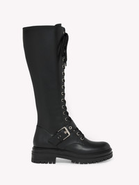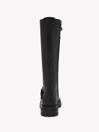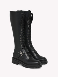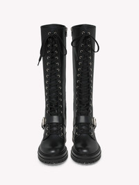 Crafted from leather, Miles is a round toe fitted knee boot with tonal laces and metallic eyelets. The tonal rubber lug sole measures 25mm at the front and 40mm at the heel height. The design is completed with an inner tonal nylon zipper. Handmade in Italy. - Composition: 100% CALF - Heel Height: 0.8 inches / 20 mm - Model Code: G80172.20GOM Item ID: G80172.20GOM.CLNNERO