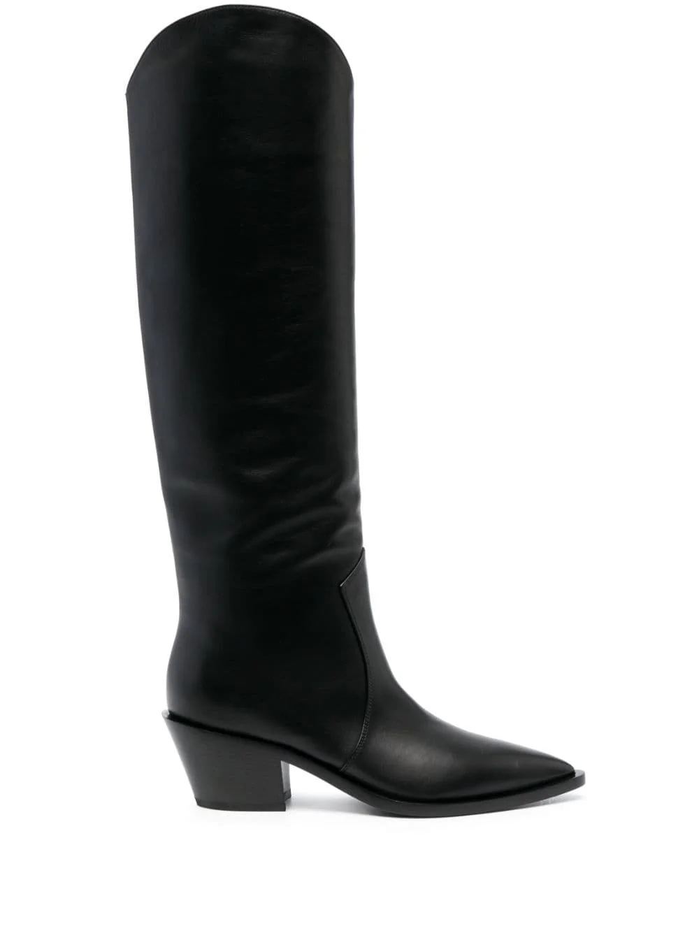 Denver 70mm leather knee boots Gianvito Rossi's knee boots riff on traditional cowboy styles. They’re crafted from smooth black leather with a curved cuff and set on a stacked Cuban heel. Highlights - Black - Calf leather - Tonal stitching - Cuban heel - Pointed toe - Slip-on style Made in Italy Composition Sole: Calf Leather 100% Outer: Calf Leather 100% Lining: Calf Leather 100%