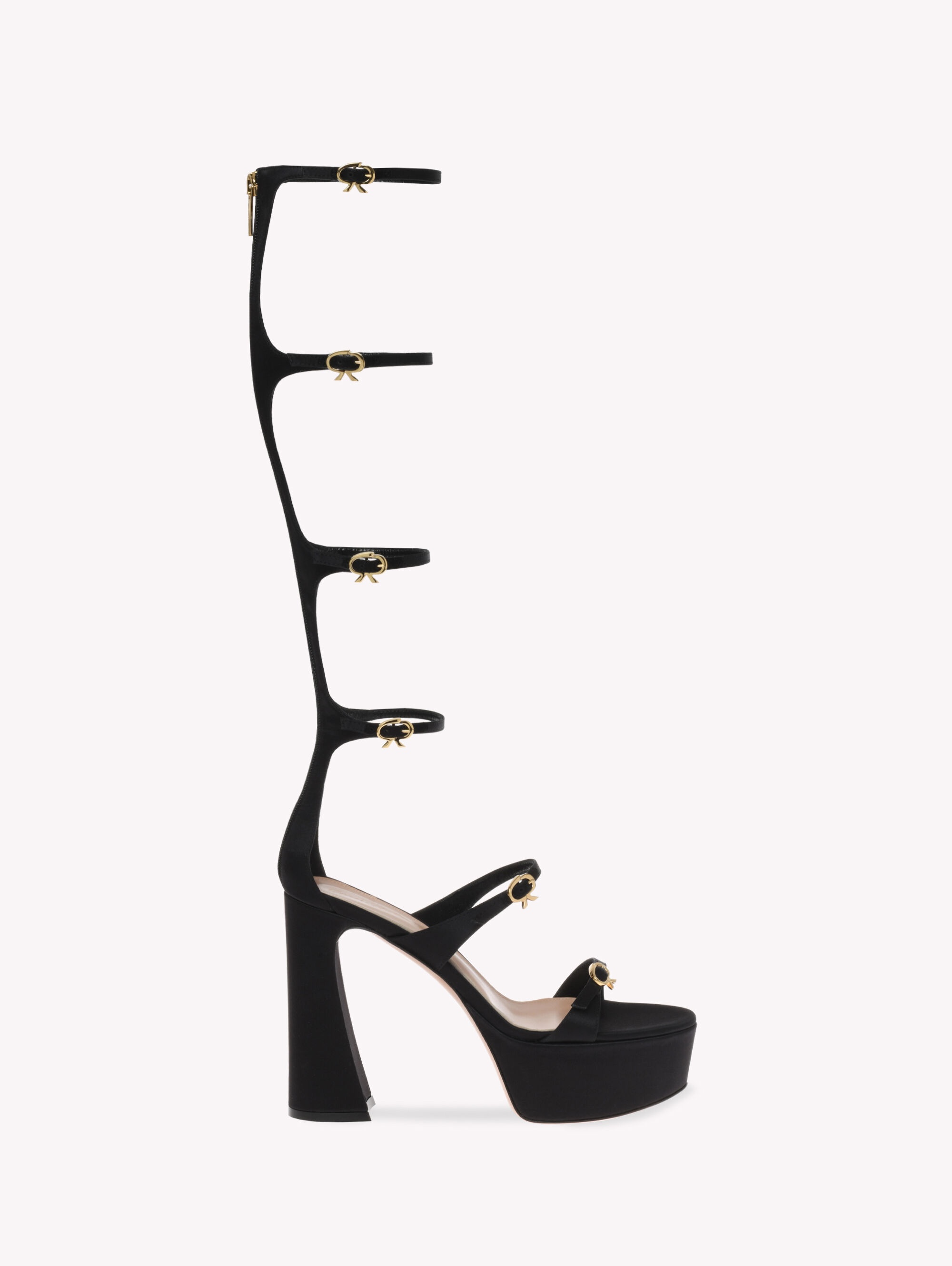 Maddy Gladiator is a round toe knee-high gladiator sandal in leather and satin. This multistrap style presents a 115mm sculptural heel and 45mm platform (the perceived height is 70mm). For an easy wearability, the back of the sandal features a tonal nylon zipper with Gianvito Rossi logo engraved on the metallic zip puller. Handmade in Italy. - Composition: 100% FABRIC - Heel height: 70 - Model Code: G61791.70RIC Item ID: G61791.70RIC.RASNERO