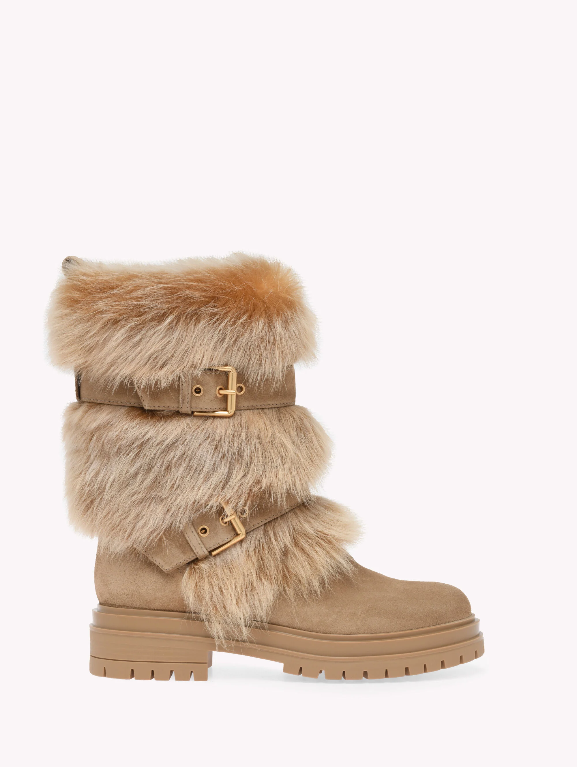 Maverick is a pull-on biker bootie with a tonal rubber sole measuring 40mm at the heel. The two upper straps are enriched with two metallic buckles and eyelets. Handmade in Italy. If you wish to return a product, you can return it for free within 30 days of the reception of your order. Please return the items in the same condition in which they were received, including dustbag, box and protective stickers. Incomplete, damaged, worn or altered items cannot be accepted as stated in our Terms and Conditions . Standard shipping FREE (3-5 business days) Express shipping $60 (1-3 business days) Deliveries are made from Monday to Friday between 9:00 a.m. and 6:00 p.m. The time frame for delivery is calculated from the time your order is dispatched, not from the time your order was placed. Please check our Shipping page for further information. - Composition: 60% SUEDE + 40 % NAPPA - Heel height: 0.8 inches / 20 mm - Model Code: G72984.20GOM Item ID: G72984.20GOM.SBACMDE
