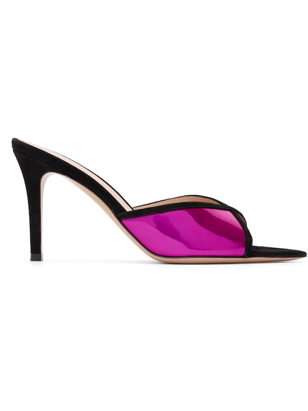 Handcrafted suede and patent leather slip-on heeled sandals. · Open pointed toe · Logo printed at padded footbed · Stiletto heel with rubber injection · Polished leather sole · Heel: H3.25" Supplier color: Black/Bloom/Freesia Upper: textile, leather. Sole: leather, rubber. Made in Italy 261090F125039