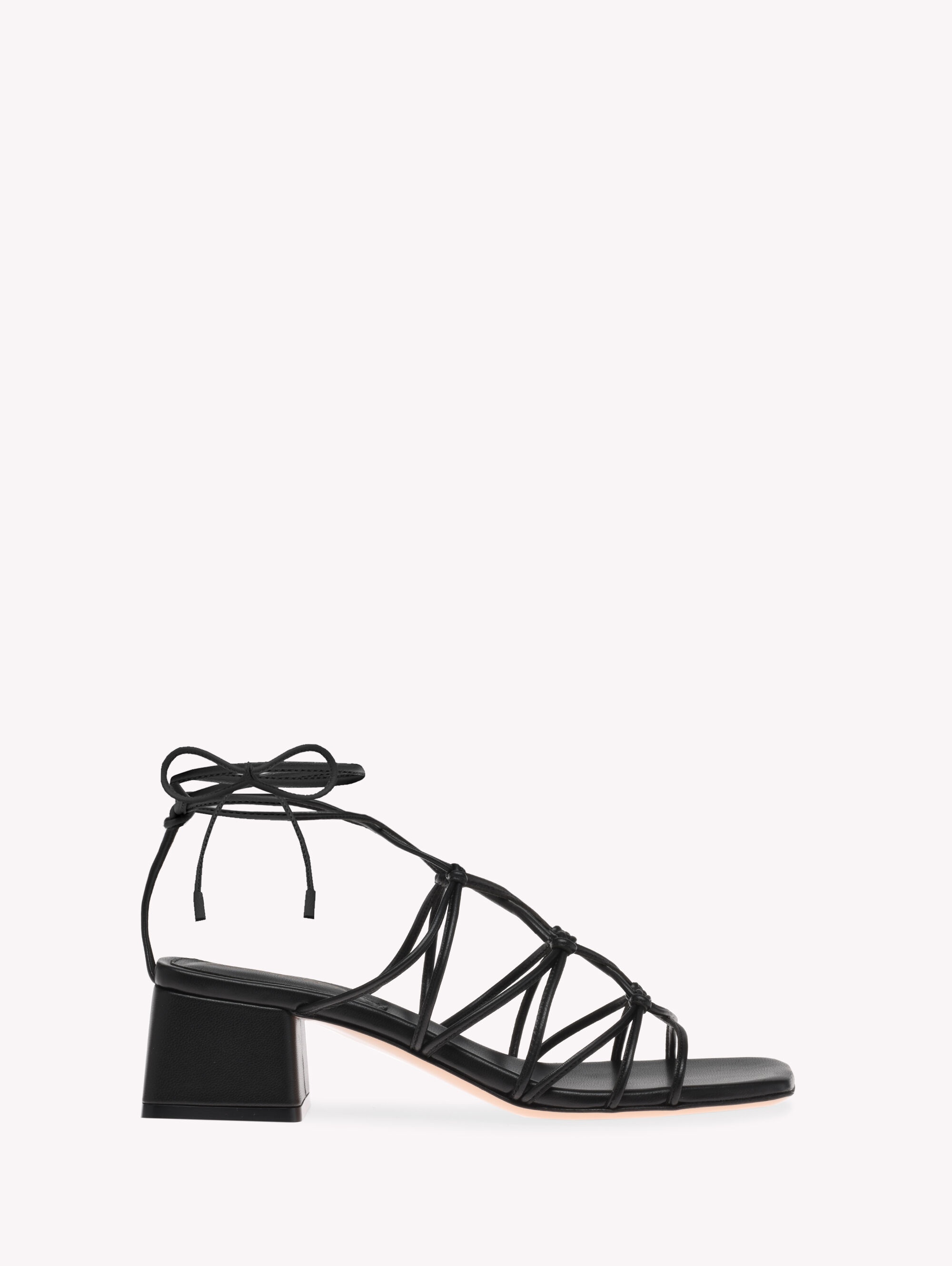 The intriguing cage design of the Minas 45 sandal creates a light, delicate pattern on the foot, embellished with tiny knots. Set on a 45mm block heel, this square-toe sandal is handcrafted in Italy from soft precious leather. - Composition: 100% NAPPA - Heel height: 45 - Model Code: G32221.45RIC Item ID: G32221.45RIC.NAPNERO