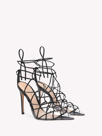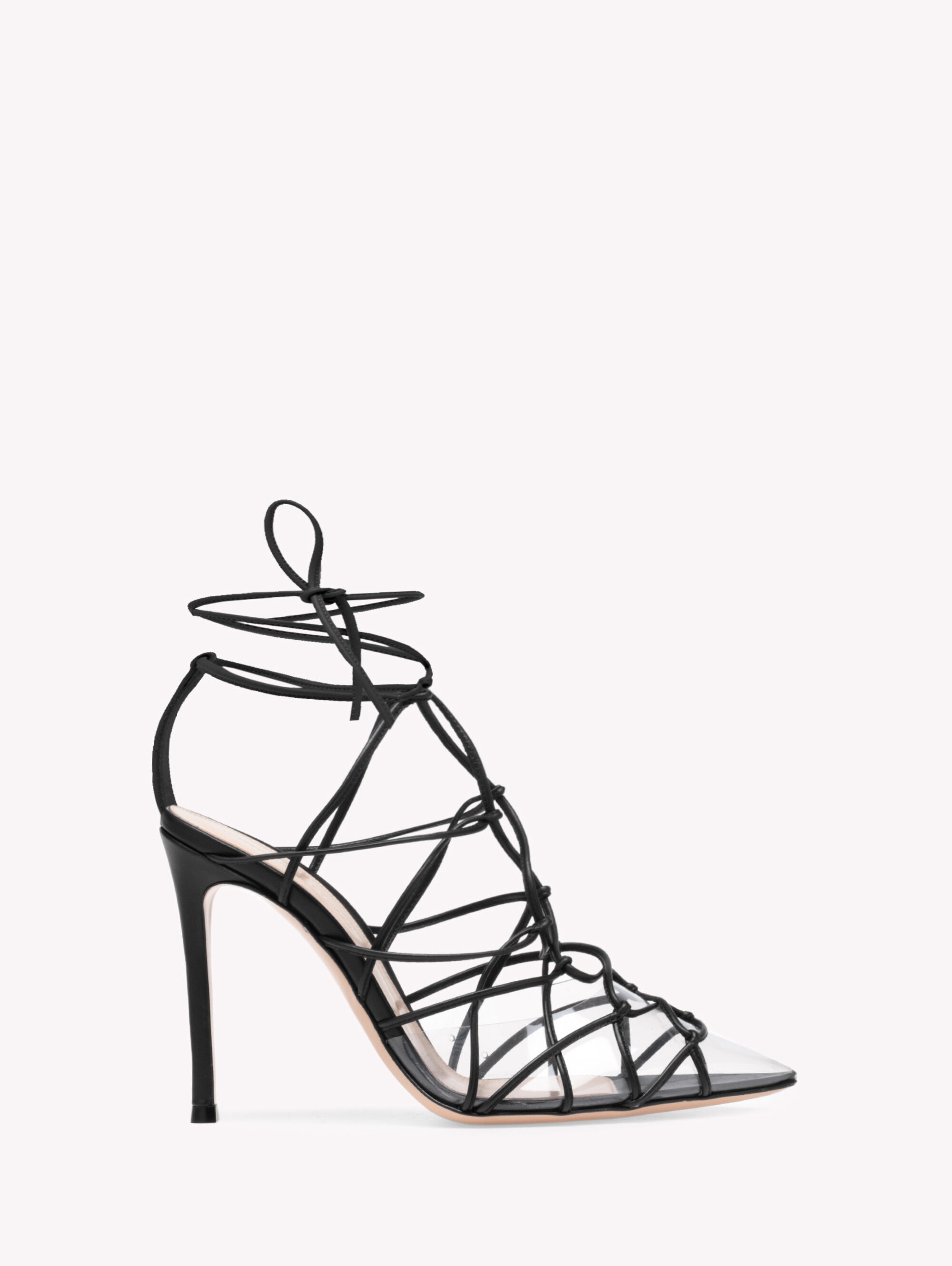 Miria is a pointed lace-up stiletto pump, beautifully defined by an intricate cage construction, with nappa leather straps that delicately wrap around the ankle, a plexi toe-cap and a pin thin 105mm heel. Handmade in Italy. - Heel height: 105 - Model Code: G95386.15RIC Item ID: G95386.15RIC.PLNTRNE