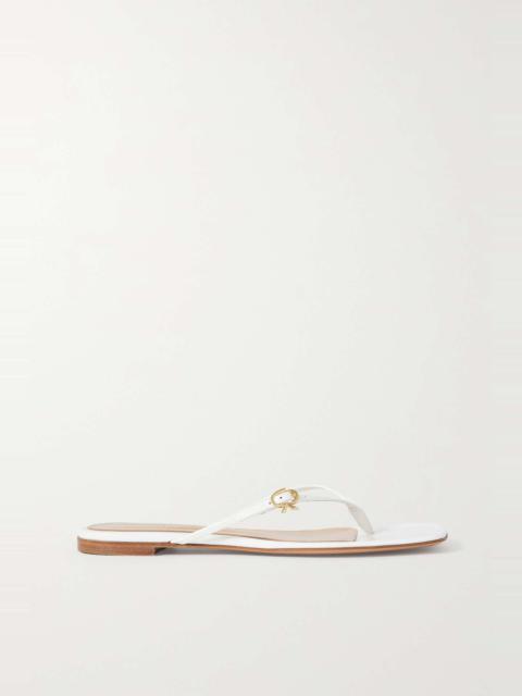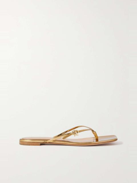 EDITORS'NOTES The minimal design of Gianvito Rossi's square-toe sandals ensures they go with nearly any outfit. Made from gold mirrored-leather, they have a signature ribbon-shaped buckle along the slim strap and rest on a slight wooden heel. SIZE & FIT - Fits true to size, take your normal size - Italian sizing DETAILS & CARE - Slight heel - Gold mirrored-leather (Calf) - Buckle-fastening strap