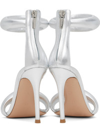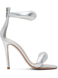 Grained nappa leather heeled sandals in silver tone. · Open toe · Padded strap at vamp · Padded ankle strap · Zip closure at heel · Logo stamp at padded footbed · Covered stiletto heel with rubber injection · Leather sole · Heel: H4" Supplier color: Silver Upper: leather. Sole: leather, rubber. Made in Italy 251090F125003