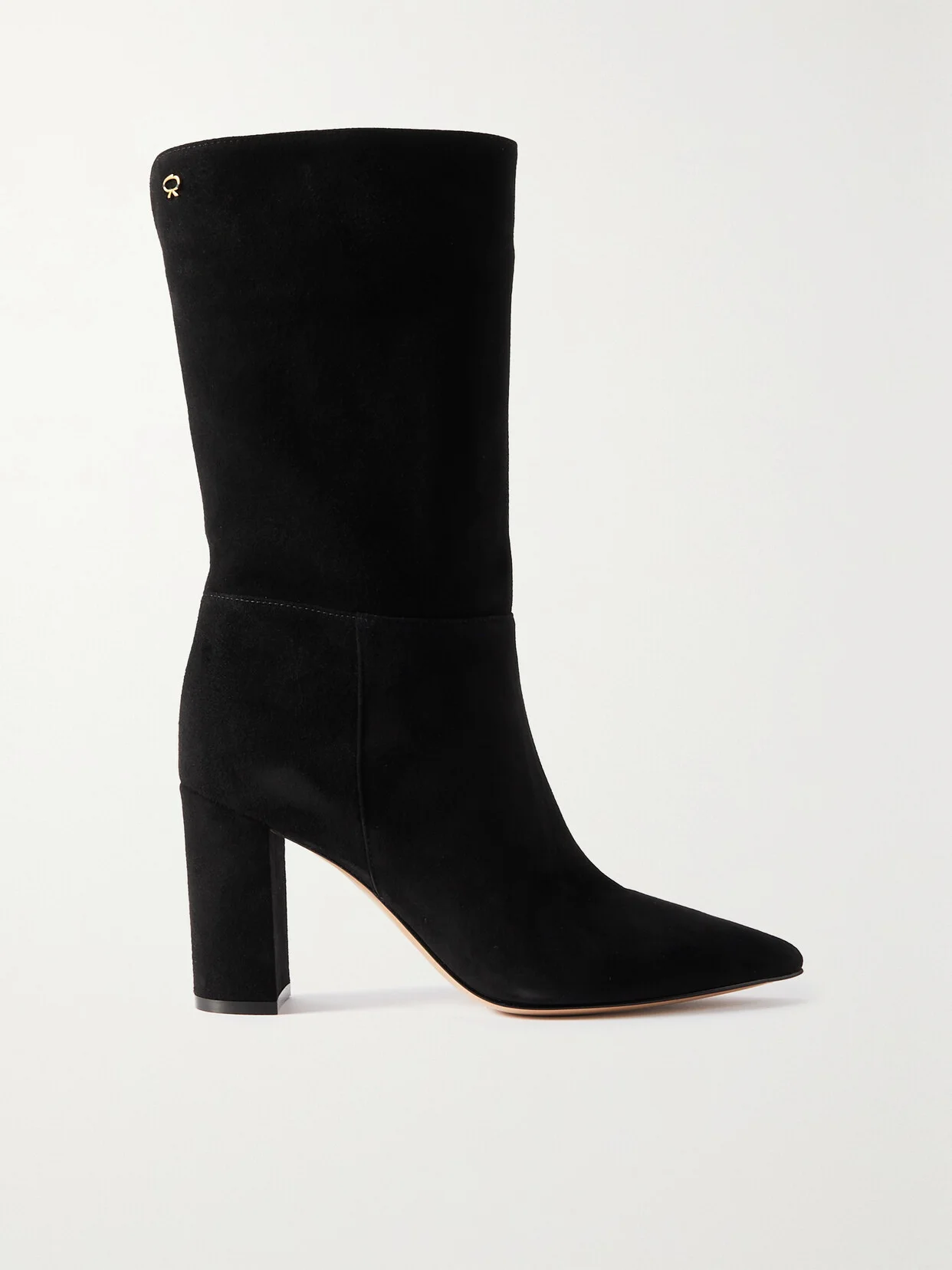 Gianvito Rossi's exceptional Italian craftsmanship is clear to see in these 'Piper' boots. Crafted in Italy from black suede, they have pointed toes and rest on chunky block heels. Style yours with mini hemlines to showcase the gold-tone logo.