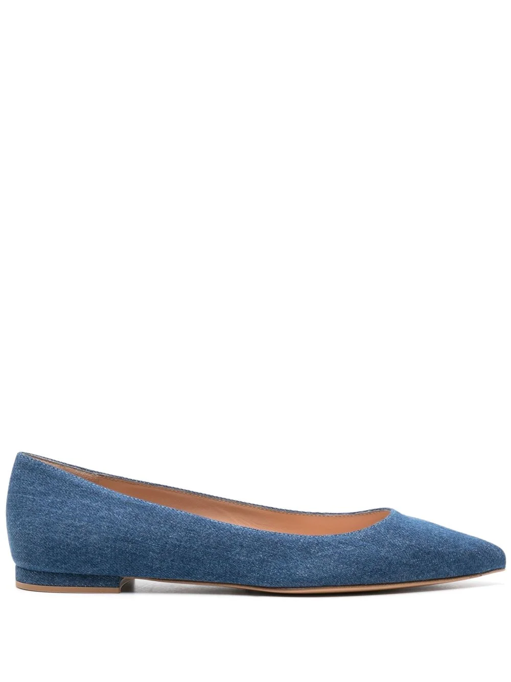 pointed-toe denim ballerina shoes Highlights - Indigo blue - Denim - Slip-on style - Pointed toe - Leather lining - Branded leather insole - Low heel Made in Italy Composition Outer: Fabric 100% Lining: Calf Leather 100% Sole: Calf Leather 100% SIZE & FIT Measurement HEEL 0.39 in(1 cm)