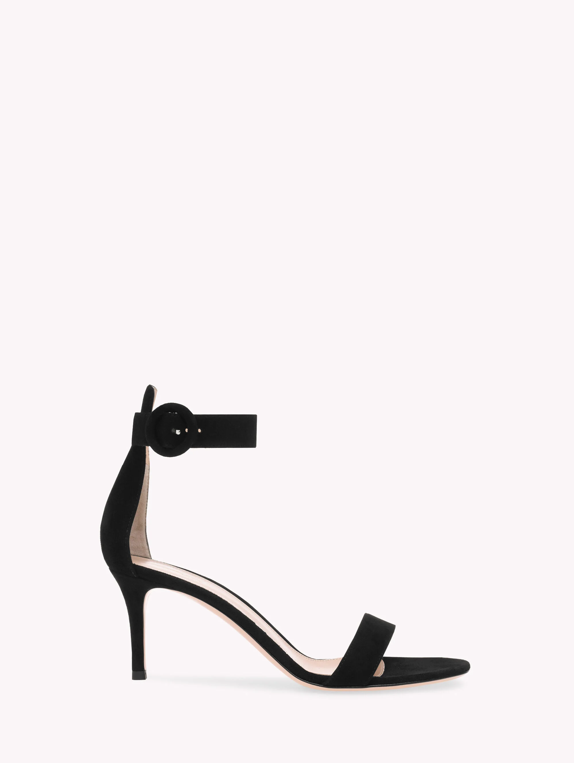 Minimalist and iconic, the aesthetic of the Portofino 70 sandal is finely distinguished by a front strap and a 70mm stiletto heel. The higher strap also features a matching round buckle. Handmade in Italy. - Composition: 100% SUEDE - Heel height: 70 - Model Code: G60088.70RIC Item ID: G60088.70RIC.CAMNERO