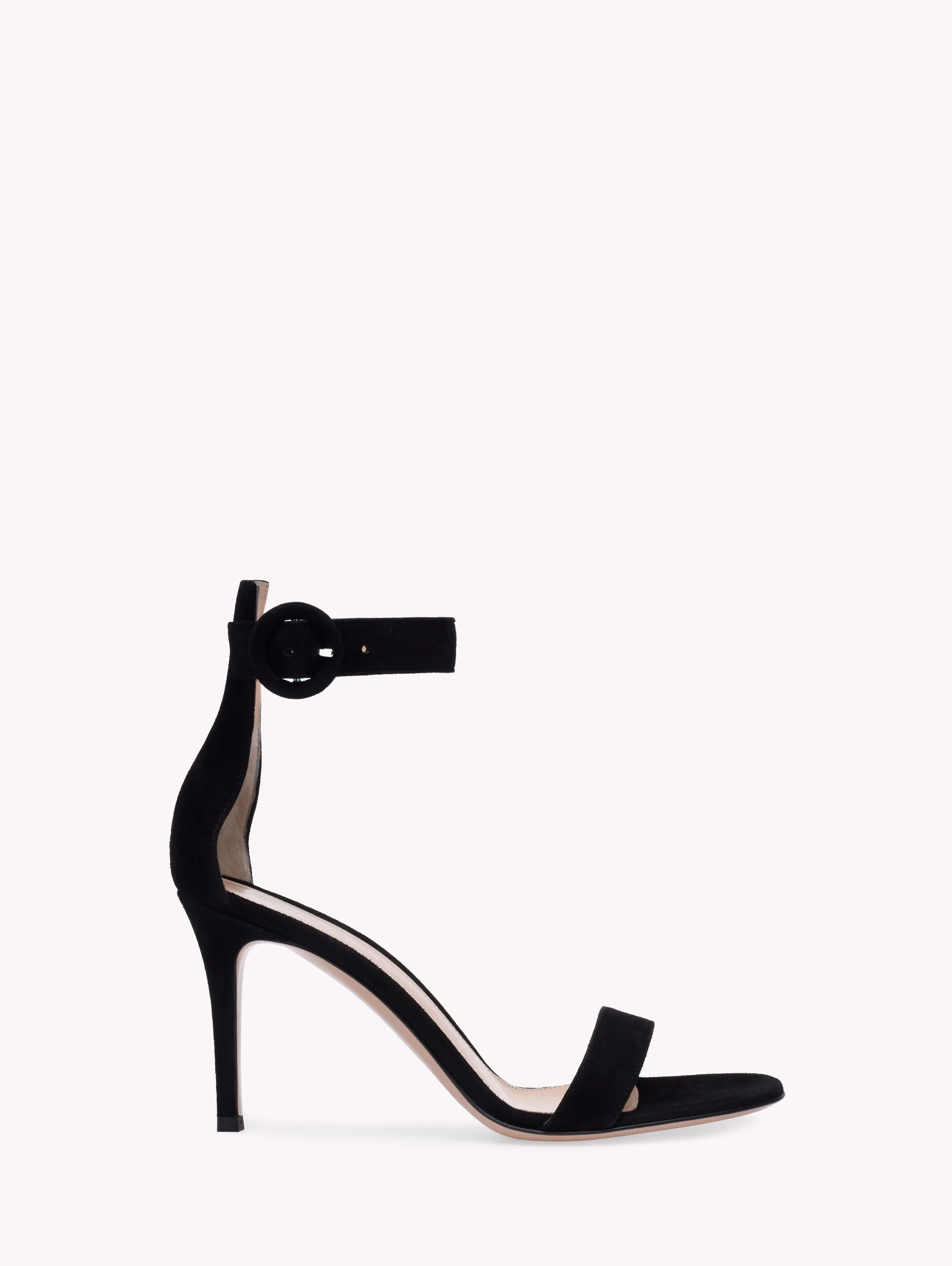 A mid heel version of our beloved iconic Portofino. The Portofino 85 features a higher strap and a covered buckle with a front strap, both crafted in black from our soft suede with lightly cushioned insoles. Those signature sandals reflecting a minimal aesthetic are as sophisticated as they are comfortable. - Composition: 100% SUEDE - Heel height: 85 - Model Code: G60953.85RIC Item ID: G60953.85RIC.CAMNERO