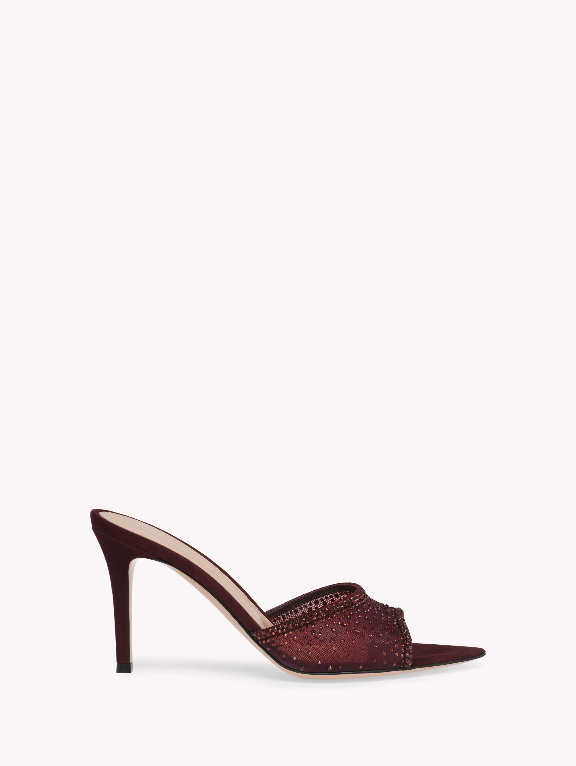 Crafted from see-through silk organza and finished with a suede trim, Rania Mule 85 is a pointed open toe style with an 85mm stiletto heel covered in matching suede. Each pair is enriched with approximately 1450 precious crystals. Handmade in Italy. - Composition: 30% SUEDE + 70% FABRIC - Heel Height: 3.3 inches / 85 mm - Model Code: G15040.85RIC Item ID: G15040.85RIC.COZRYRY