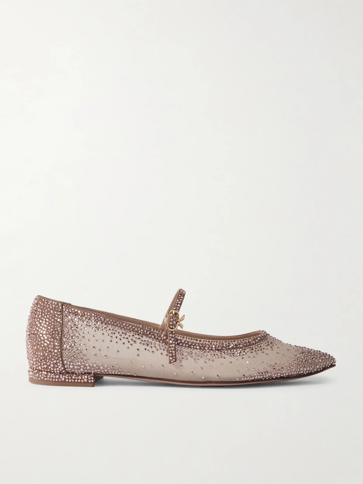 Gianvito Rossi's 'Rania' ballet flats are embellished with scores of light-catching crystals that are more concentrated at the pointed toe and even decorate the slight heel. They're made from lightweight organza and trimmed with suede. Don't miss the bow-shaped buckle, which is a recurring brand signature.