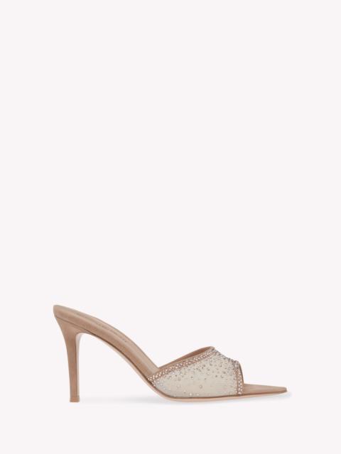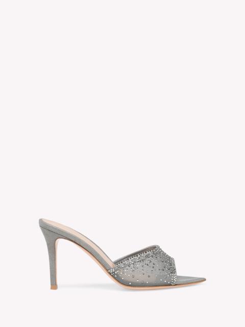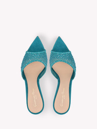 Crafted from see-through silk organza and finished with a suede trim, Rania Mule 85 is a pointed open toe style with an 85mm stiletto heel covered in matching suede. Each pair is enriched with approximately 1450 precious crystals. Handmade in Italy. - Composition: 30% SUEDE + 70% FABRIC - Heel Height: 3.3 inches / 85 mm - Model Code: G15040.85RIC Item ID: G15040.85RIC.COZTLTL