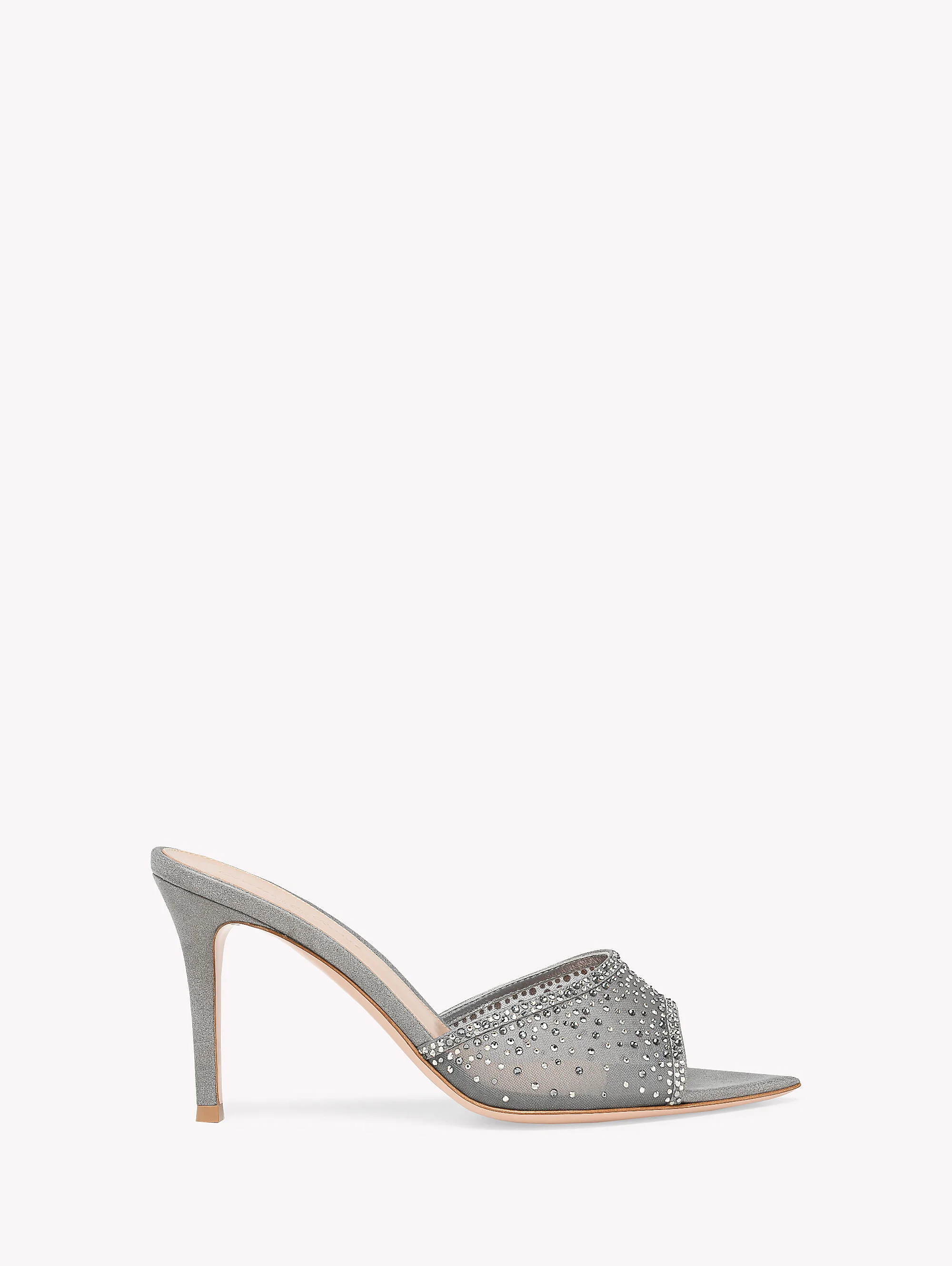 Crafted from see-through silk organza and finished with a suede trim, Rania Mule 85 is a pointed open toe style with an 85mm stiletto heel covered in matching suede. Each pair is enriched with approximately 1450 precious crystals. Handmade in Italy. - Composition: 30% SUEDE + 70% FABRIC - Heel Height: 3.3 inches / 85 mm - Model Code: G15040.85RIC Item ID: G15040.85RIC.BORACCA