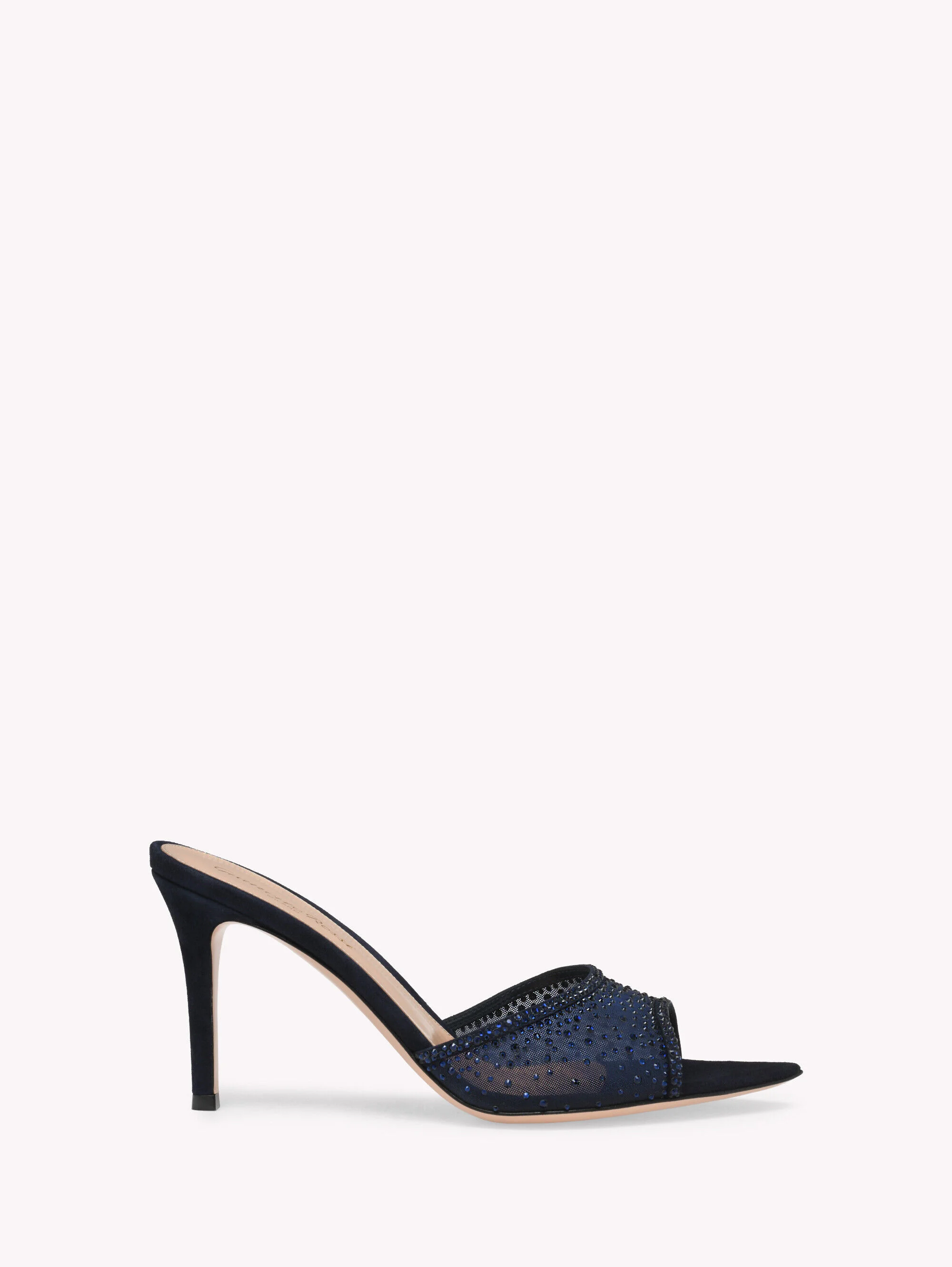 Crafted from see-through silk organza and finished with a suede trim, Rania Mule 85 is a pointed open toe style with an 85mm stiletto heel covered in matching suede. Each pair is enriched with approximately 1450 precious crystals. Handmade in Italy. - Composition: 30% SUEDE + 70% FABRIC - Heel Height: 3.3 inches / 85 mm - Model Code: G15040.85RIC Item ID: G15040.85RIC.COZDEDE