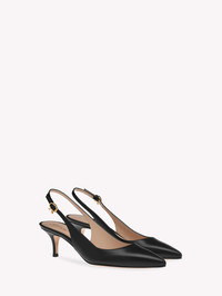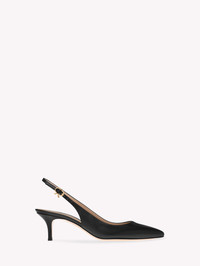 The Ribbon sling is an elegant kitten heel style featuring a pointy-toe and a graceful gold ribbon deatil that discretly seals this creation. Hand-crafted in Italy from the finest materials and leathers, this low heeled slinback is a perfect match for any wardrobe. - Composition: 100% CALF - Heel height: 55 - Model Code: G95266.55RIC Item ID: G95266.55RIC.VITNERO