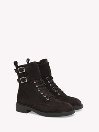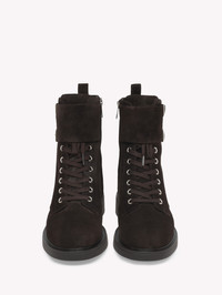 Crafted from suede, Ripley is a round toe urban bootie with tonal laces and metallic eyelets. The tonal rubber sole measures 13mm at the front and 33mm at the heel height. The design is completed with an inner tonal nylon zipper. Handmade in Italy. - Heel Height: 0.8 inches / 20 mm - Model Code: G73263.20GOM Item ID: G73263.20GOM.SUEMOKA