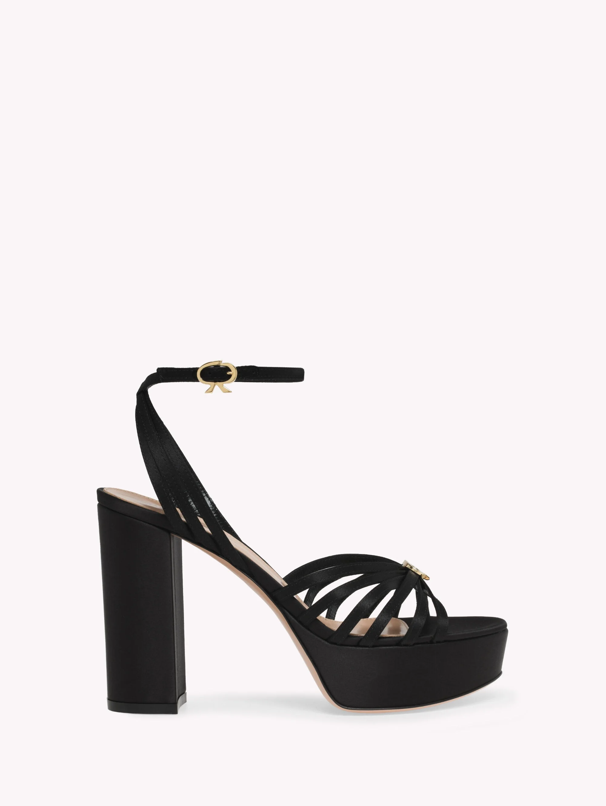 Crafted from precious satin, Rita is a round toe sandal with a 35mm platform and a 105mm chunky heel. The multistrap upper is adorned with the mini Ribbon detail, whereas the signature Ribbon buckle enriches the ankle strap. Handmade in Italy. - Composition: 100% FABRIC - Heel height: 2.8 inches / 70 mm - Model Code: G32632.70RIC Item ID: G32632.70RIC.CRENERO