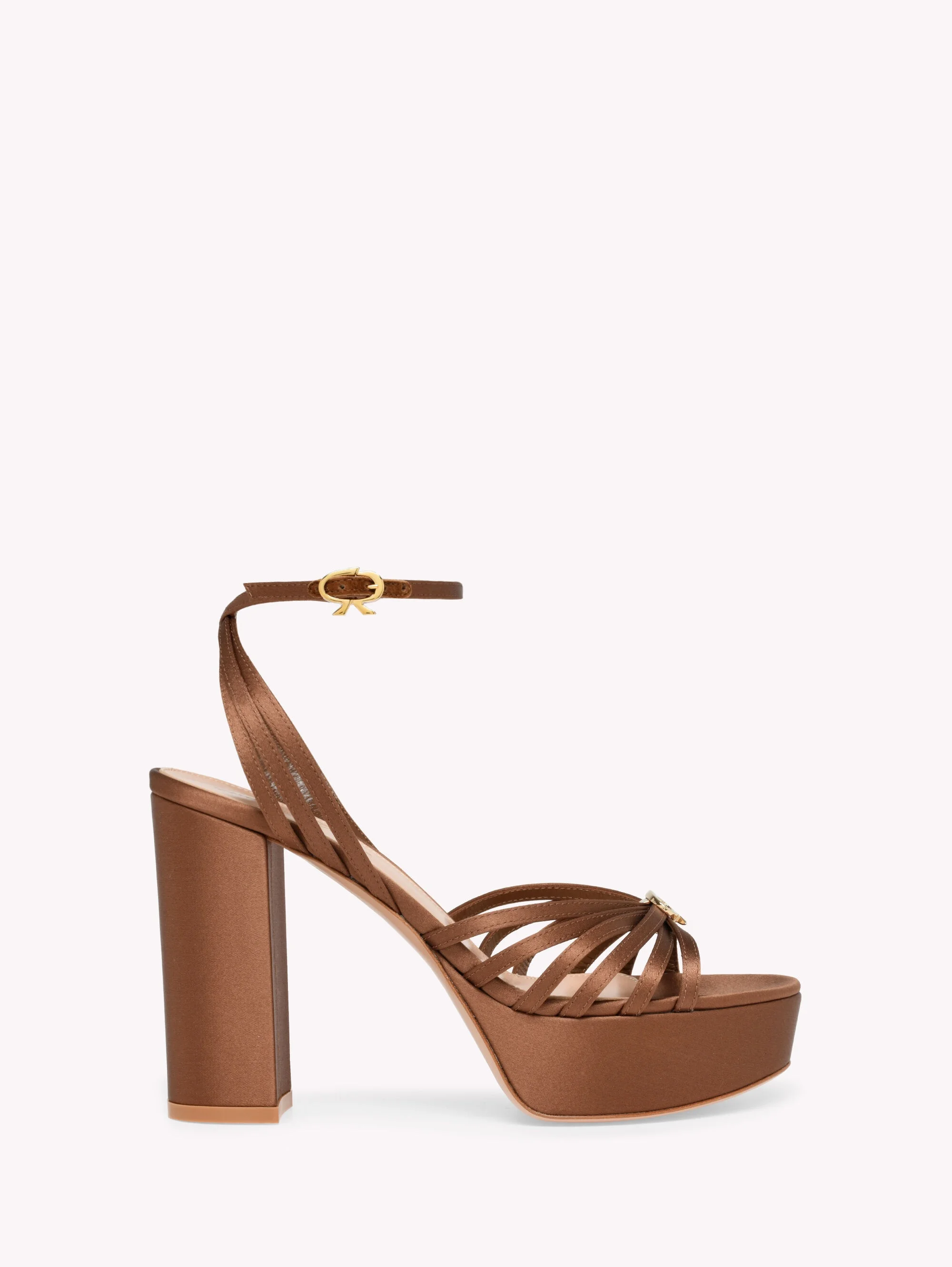 Crafted from precious satin, Rita is a round toe sandal with a 35mm platform and a 105mm chunky heel. The multistrap upper is adorned with the mini Ribbon detail, whereas the signature Ribbon buckle enriches the ankle strap. Handmade in Italy. - Composition: 100% FABRIC - Heel height: 2.8 inches / 70 mm - Model Code: G32632.70RIC Item ID: G32632.70RIC.CRETEXA