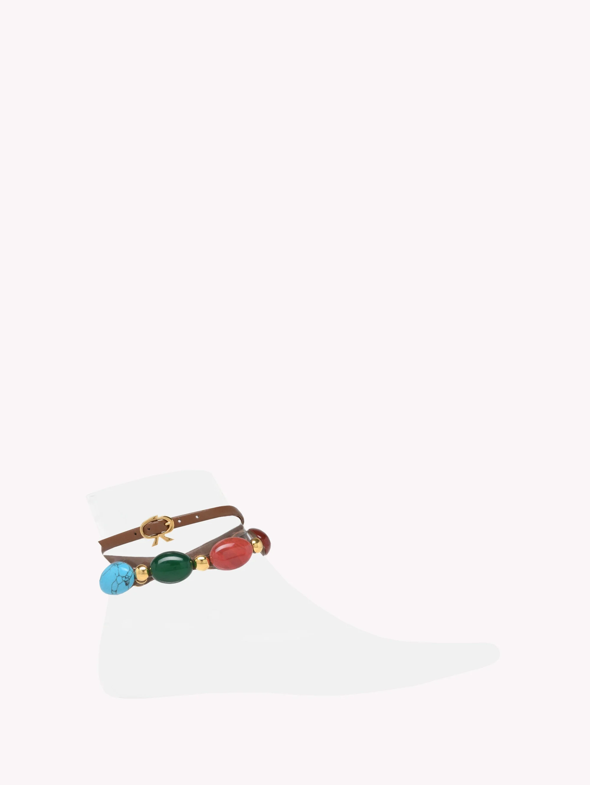 Shanti Anklet is a one size leather anklet embellished with Chakra-inspired oval natural cabochon stones and metallic studs. The anklet is right foot only. The design is finished with the iconic Ribbon buckle, signature of the Maison. Handmade in Italy. - Composition: 100% NAPPA - Model Code: QXX439.ANKLE Item ID: QXX439.ANKLE.MG9CUOI_PZ