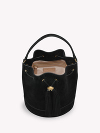 Crafted from supple suede, Sienna 22 is a bucket bag with the signature Ribbon toggle, a top handle and an adjustable and removable shoulder strap. The inside of the bag, lined in satin, presents a pocket and a metallic zip. Handmade in Italy. Size: H 25cm; W 22cm; D 18cm. - Heel Height: RI - Model Code: B00308.RIBBK Item ID: B00308.RIBBK.CAMNERO_PZ