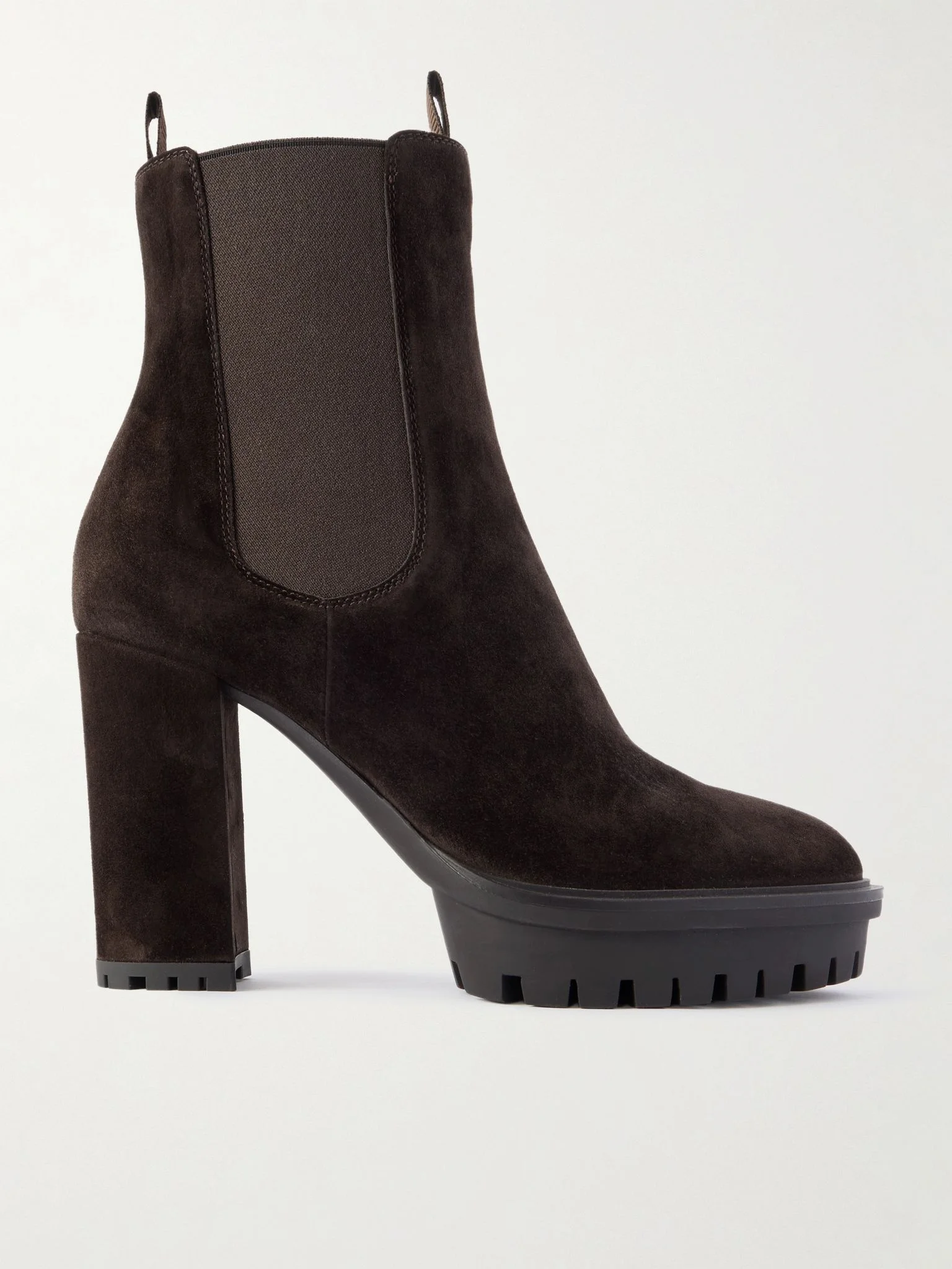 Gianvito Rossi's designs undergo countless meticulous steps, from sketch to finished product. These Chelsea boots have been handmade in Italy from smooth suede and have elasticated inserts and pull tabs. The 70mm block heels are balanced by subtle platforms. Size & Fit - Fits true to size, take your normal size - Italian sizing Details & Care - Heel measures approximately 70mm/ 3 inches - Dark-brown suede (Goat) - Pull on