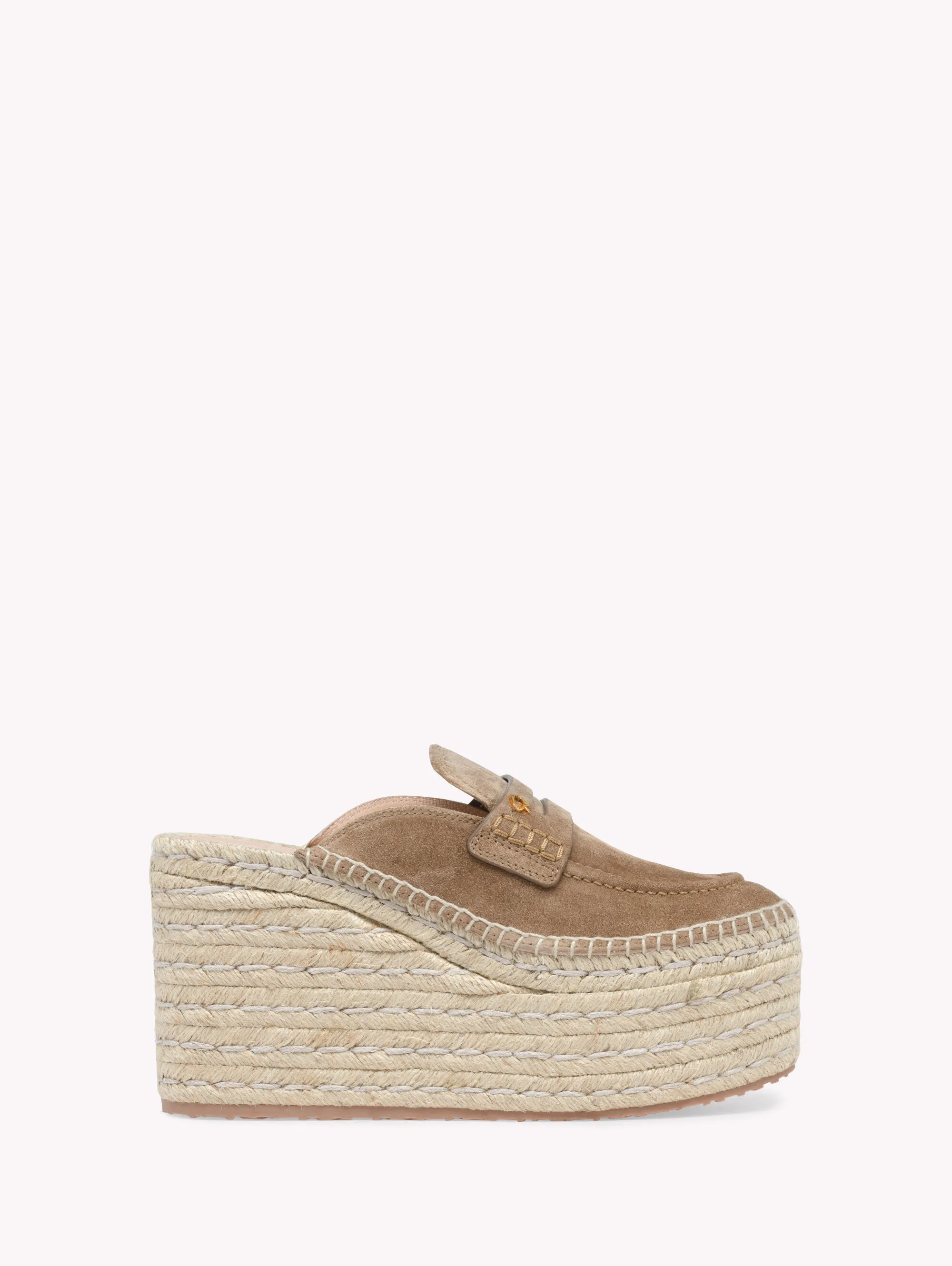 Crafted from soft suede, Maxilla is a round toe slip-on moccasin with a penny bar and mini Ribbon detail. The braided jute wedge is completed with a rubber sole and measures 100mm at the back of the heel. Handmade in Spain. If you wish to return a product, you can return it for free within 30 days of the reception of your order. Please return the items in the same condition in which they were received, including dustbag, box and protective stickers. Incomplete, damaged, worn or altered items cannot be accepted as stated in our Terms and Conditions . Standard shipping FREE (3-5 business days) Express shipping $60 (1-3 business days) Deliveries are made from Monday to Friday between 9:00 a.m. and 6:00 p.m. The time frame for delivery is calculated from the time your order is dispatched, not from the time your order was placed. Please check our Shipping page for further information. - Composition: 100% CALF - Model Code: G93056.40RIC Item ID: G93056.40RIC.VLJCMNA