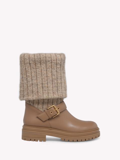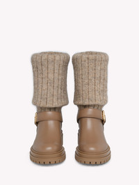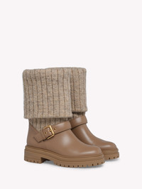 Crafted from leather and ribbed stretch knitted fabric, Thurso is a pull-on biker boot with a tonal rubber sole measuring 40mm at the heel. The strap detail is enriched with a metallic buckle and eyelets. Handmade in Italy. If you wish to return a product, you can return it for free within 30 days of the reception of your order. Please return the items in the same condition in which they were received, including dustbag, box and protective stickers. Incomplete, damaged, worn or altered items cannot be accepted as stated in our Terms and Conditions . Standard shipping FREE (3-5 business days) Express shipping $60 (1-3 business days) Deliveries are made from Monday to Friday between 9:00 a.m. and 6:00 p.m. The time frame for delivery is calculated from the time your order is dispatched, not from the time your order was placed. Please check our Shipping page for further information. - Composition: 30% CALF + 70% FABRIC - Heel height: 0.8 inches / 20 mm - Model Code: G80118.20GOM Item ID: G80118.20GOM.CKHDESD