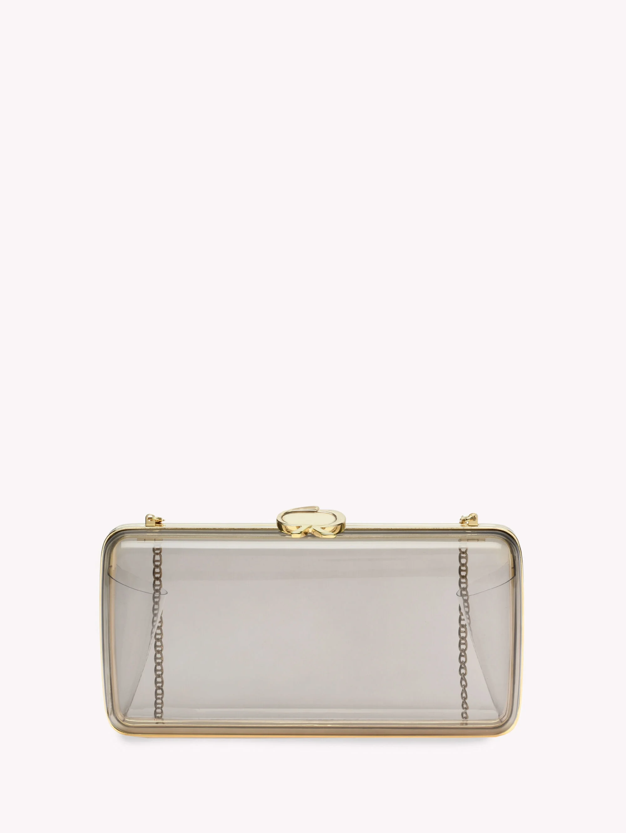 Elegant, modern, and graphic, Vetra is a rigid-frame clutch in glossy Plexi with an ultra-polished gold-toned metal frame. Providing a romantic touch to its linear design is the signature Ribbon clasp. Whether hand-held or worn cross-body, thanks to a detachable chain strap, it will certainly make a statement. Made in Italy. - Model Code: B00386.CLUTC Item ID: B00386.CLUTC.PLXFUME_PZ