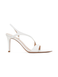 Handcrafted buffed calfskin heeled sandals in white. · Open pointed toe · Straps at vamp · Partially elasticized slingback strap · Padded footbed · Covered stiletto heel with rubber injection · Calfskin sole · Heel: H3.25" Supplier color: White Calfskin. Made in Italy 241090F125052