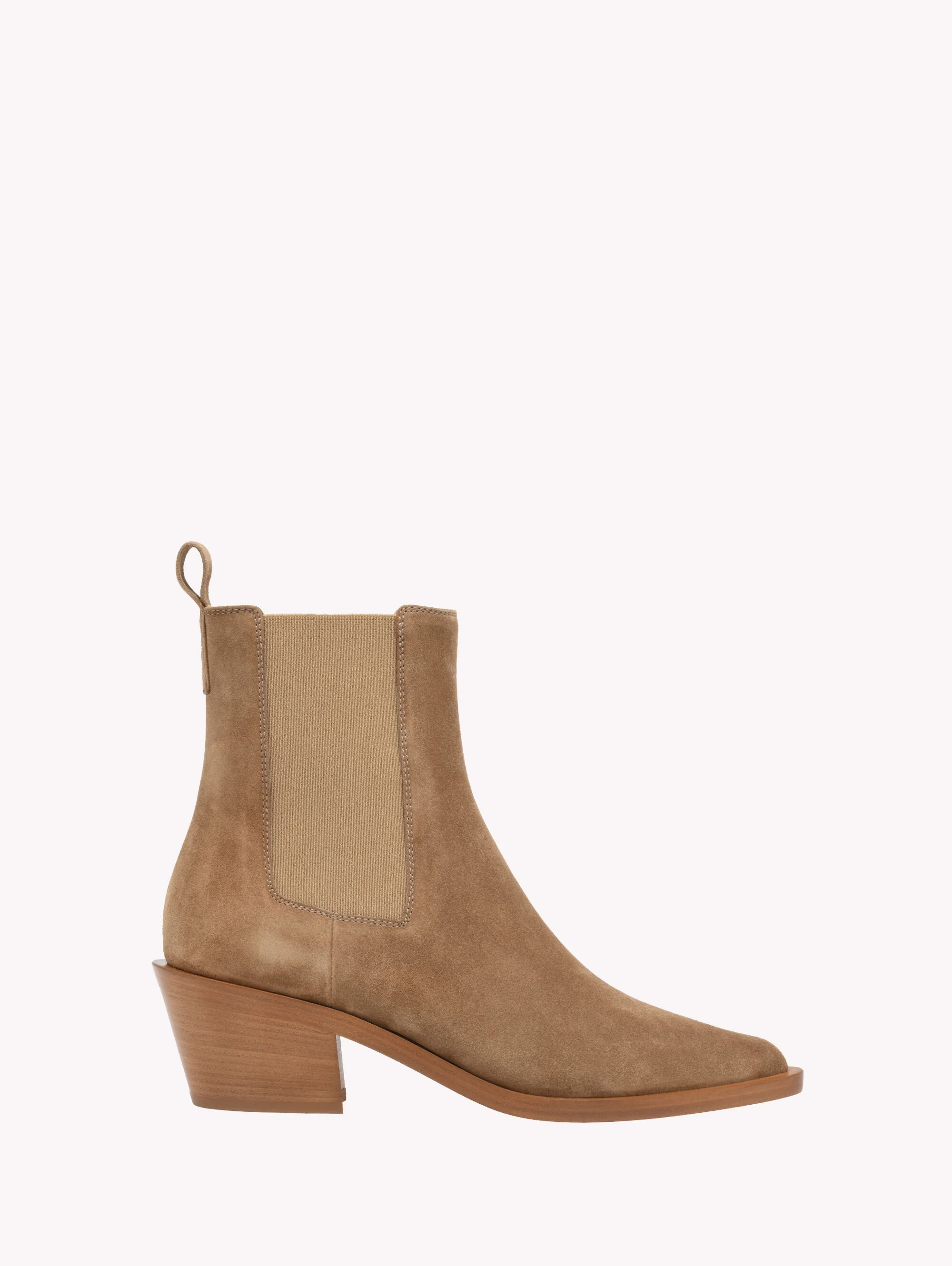 Crafted from supple suede, Wylie is a pointed-toe fitted Chelsea bootie with a 55mm Western heel. The design presents tonal elastic inserts on both sides for easy wearability. Handmade in Italy. - Composition: 100% SUEDE - Heel height: 1.8 inches / 45 mm - Model Code: G72901.45CUO Item ID: G72901.45CUO.CASCAML