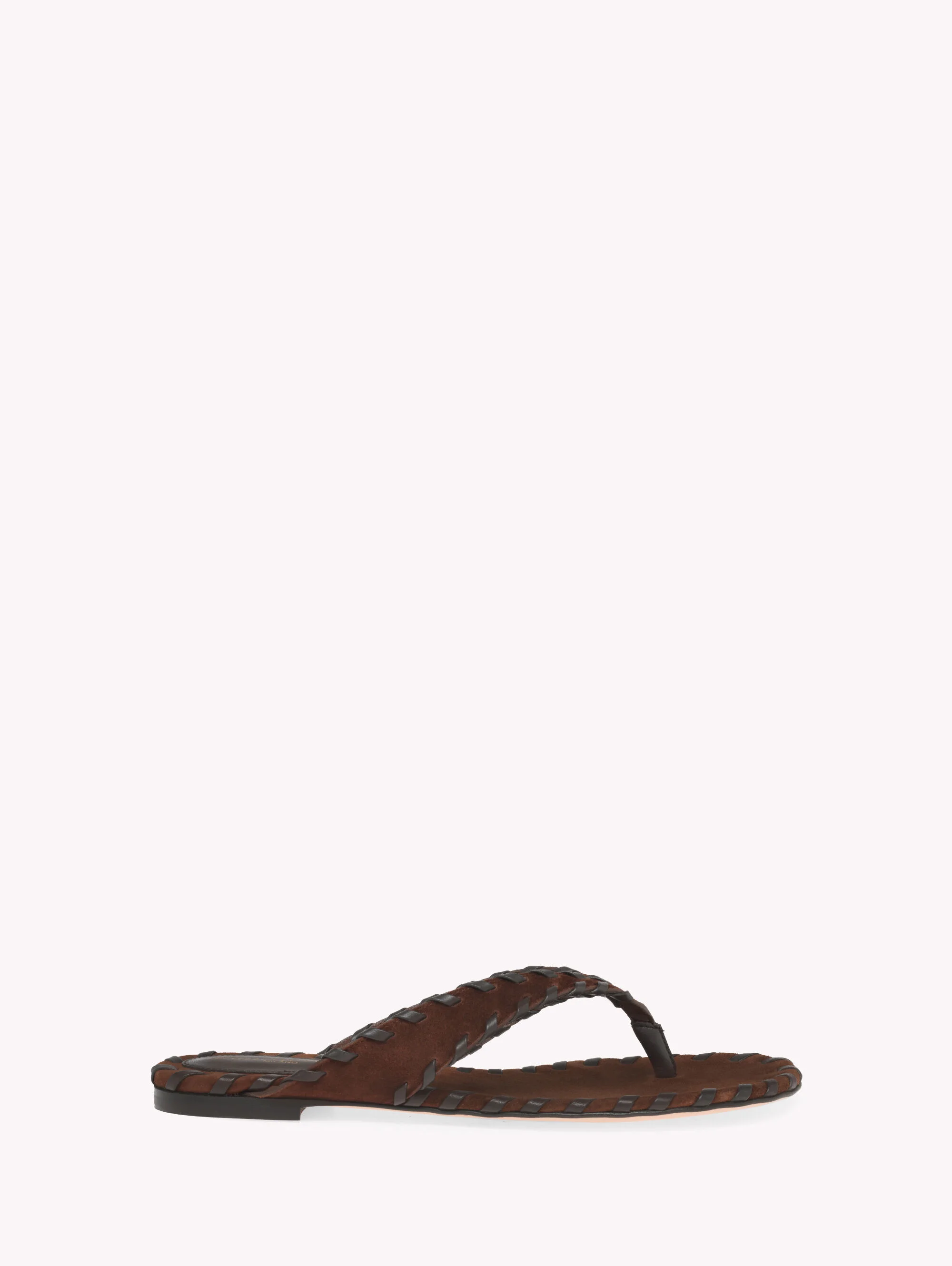 Crafted from suede and leather, Zaira Thong Flat is a round toe style with a 10mm stiletto heel. The Moroccan weave technique shapes the unique craftsmanship of this style, gently threaded with a soft leather strip. Its distinctive pattern takes about one hour to come to life. Handmade in Italy. - Composition: 90%SUEDE+10%LAMB - Heel Height: 0.2 inches / 5 mm - Model Code: G10173.05CUO Item ID: G10173.05CUO.XNCMOBO