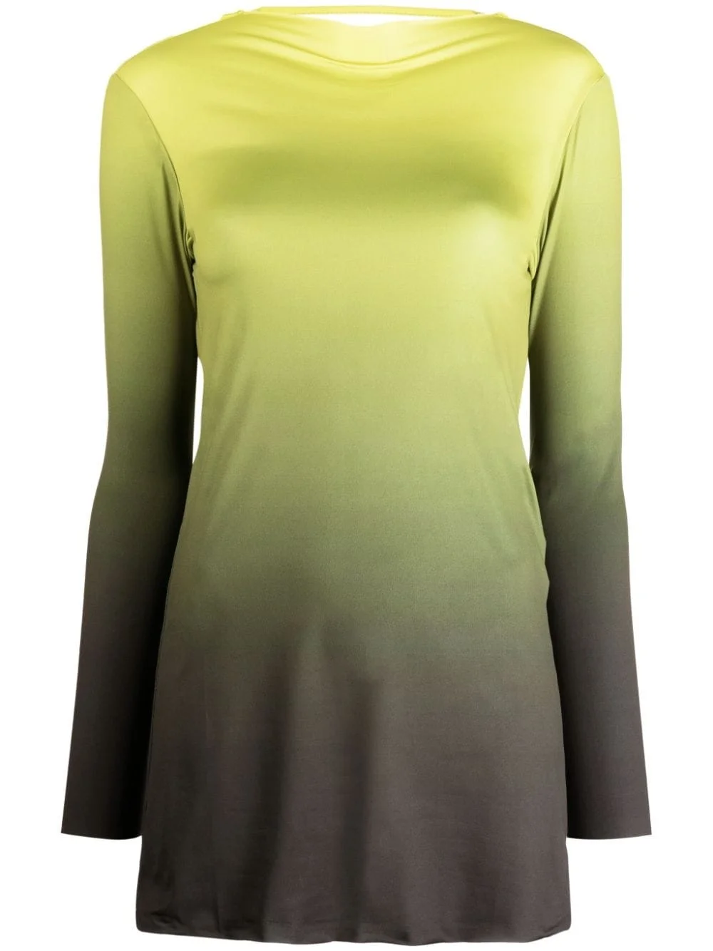 Alba gradient-effect minidress Gimaguas' Alba minidress is characterised by a gradient effect that gently transitions from light to dark hues of green. It's designed in a slim silhouette highlighted by a low back with a cascading cowl effect. Highlights - Light green/dark green - Gradient effect - Boat neck - Long sleeves - Low back - Cowl effect - Straight hem - Thigh-length Imported Composition Polyester 100% SIZE & FIT Model measurements Height 5 ft 10 in(1.77 m) Bust/Chest 31.49 in(80 cm) Hips 35.43 in(90 cm) Waist 25.19 in(64 cm) FittingInformation Designed for a slim fit that sits just away from the body offering a close yet comfortable fit Made from a midweight stretch fabric, this piece offers elasticity and flexibility when worn This piece fits true to size – take your usual size Washing instructions Hand Wash
