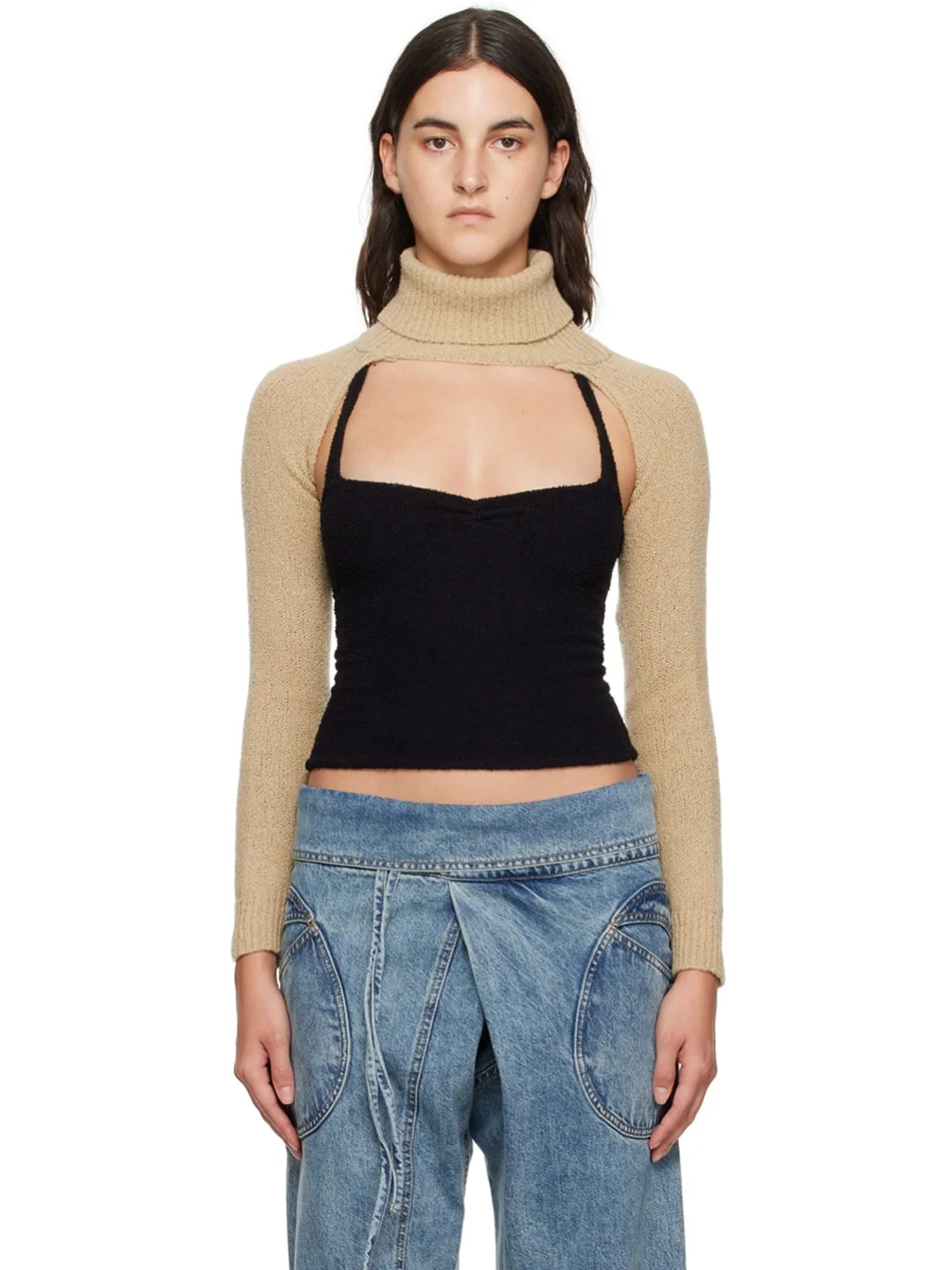 Rib knit nylon- and mohair-blend bolero-style turtleneck. · Open front · Raglan sleeves Supplier color: Beige