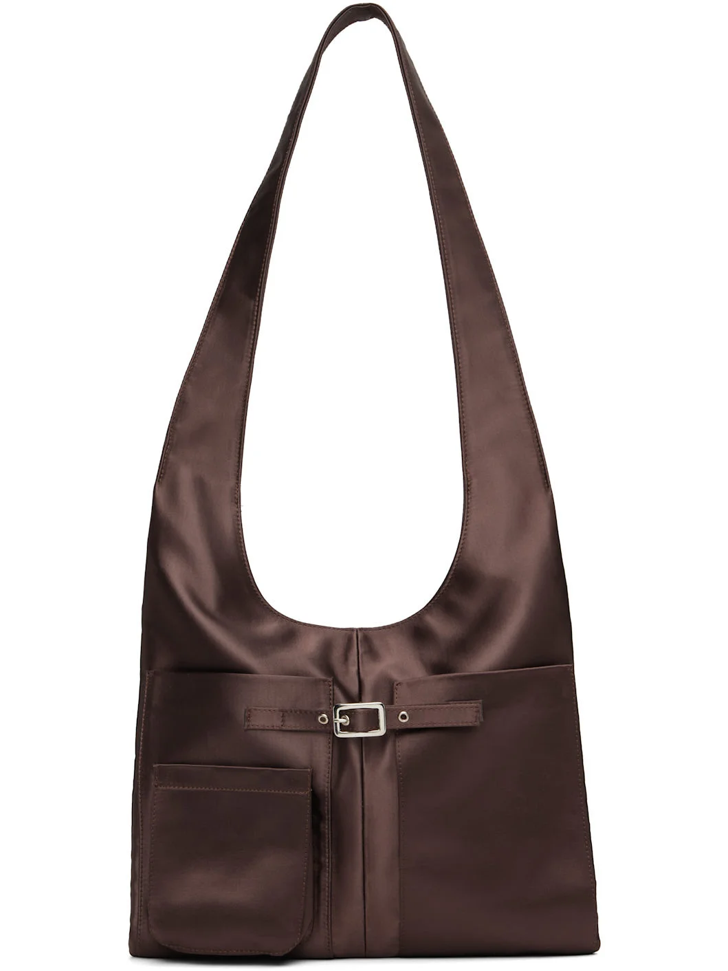 Cotton-blend sateen shoulder bag. · Fixed shoulder strap · Patch pockets and pin-buckle tab at face · Logo hardware at back face · Magnetic closure · Patch pocket at interior · Twill lining · Silver-tone hardware · H10" x W12.75" Supplier color: Brown 59% cotton, 41% polyester. Made in Spain 252776F048013