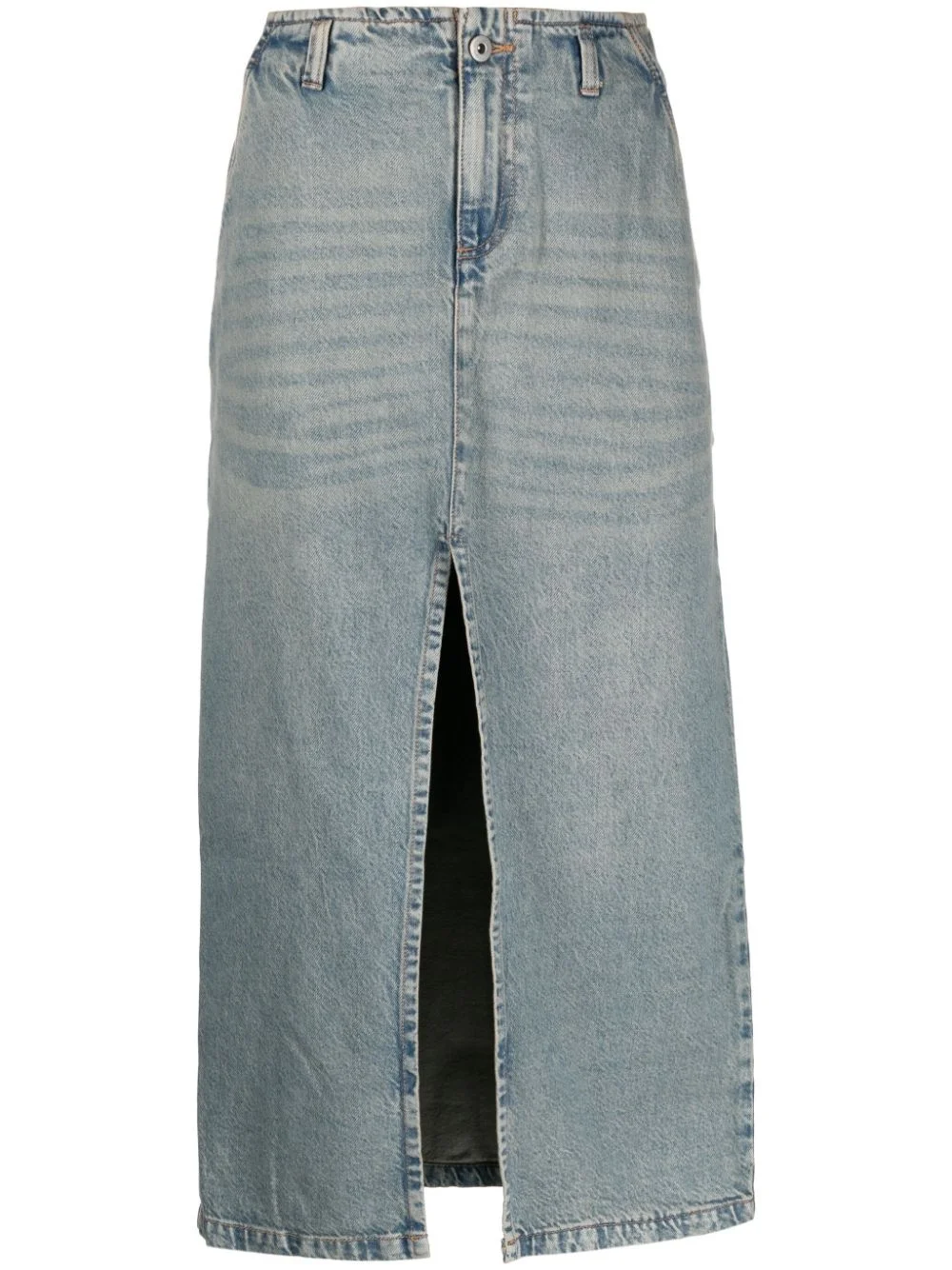 front-slit cotton denim midi skirt Highlights - Light blue - Cotton - Denim - Front slit - Belt loops - Button fly fastening - Mid-length - Straight hem Imported Composition Cotton 100% Washing instructions Machine Wash