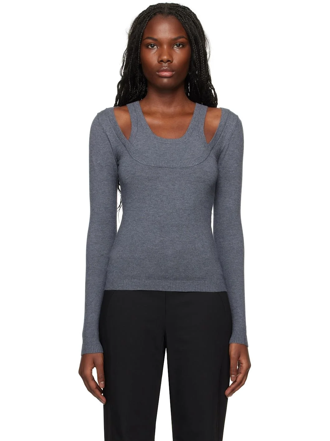 Knit viscose-blend sweater. · Paneled construction · Rib-knit scoop neck, hem, and cuffs · Cutouts at front Supplier color: Dark grey 72% viscose, 28% polyester. Made in Estonia 242776F110019