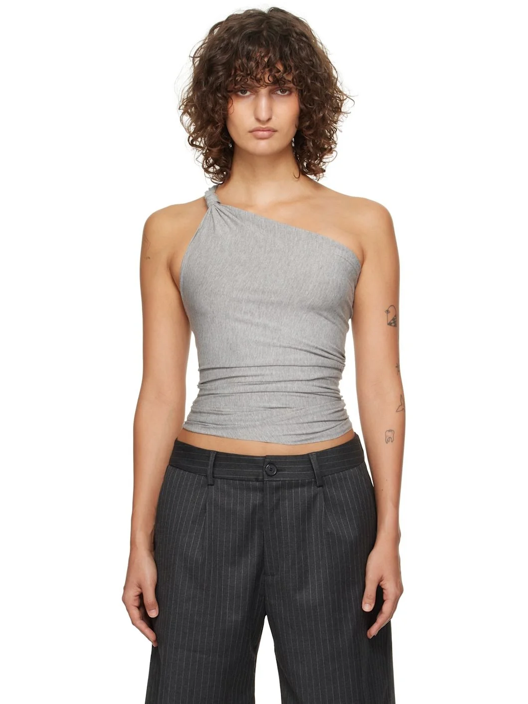 Stretch viscose jersey tank top. Gathering throughout. · Asymmetric single-shoulder construction · Knotted accent at shoulder strap Supplier color: Grey 96% viscose, 4% elastane. Made in Portugal 242776F111010