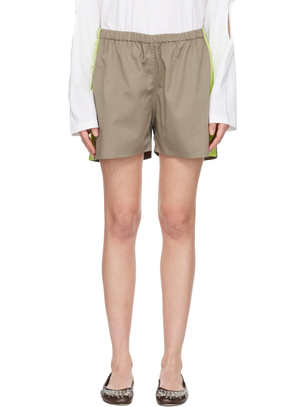 Cotton twill shorts. · Elasticized waistband · Single-pocket styling · Sateen stripe at outseams Supplier color: Green 100% cotton. Made in Portugal 261776F088008