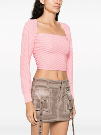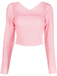 Marianne Mangas ribbed-knit jumper Highlights - Flamingo pink - Organic cotton - Diagonal ribbed knit - Square neck - Drop shoulder - Long draped sleeves - Ribbed cuffs - Crossover neck - Cropped Imported Composition Organic Cotton 100% SIZE & FIT Measurement LENGTH 14.56 in(37 cm) Washing instructions Hand Wash