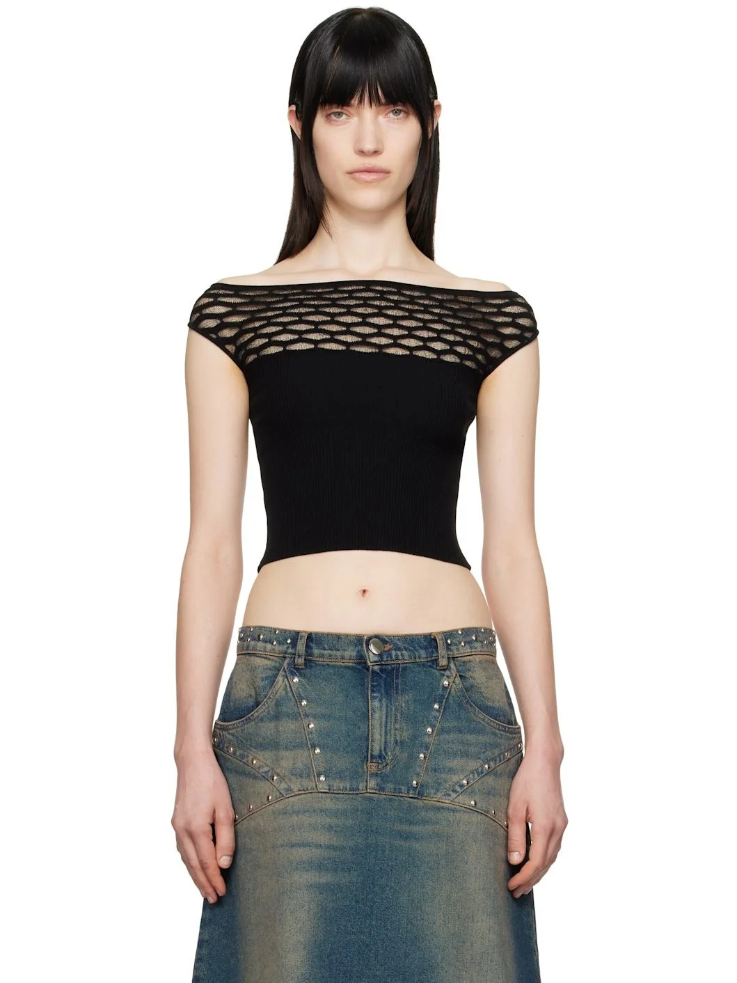 Rib-knit viscose- and polyester-blend T-shirt. · Alternate function as turtleneck · Off-the-shoulder construction · Rolled edge at open-knit straight neck Available exclusively at SSENSE. Supplier color: Black 54% viscose, 31% polyester, 15% recycled polyester. Made in Spain 251776F110014