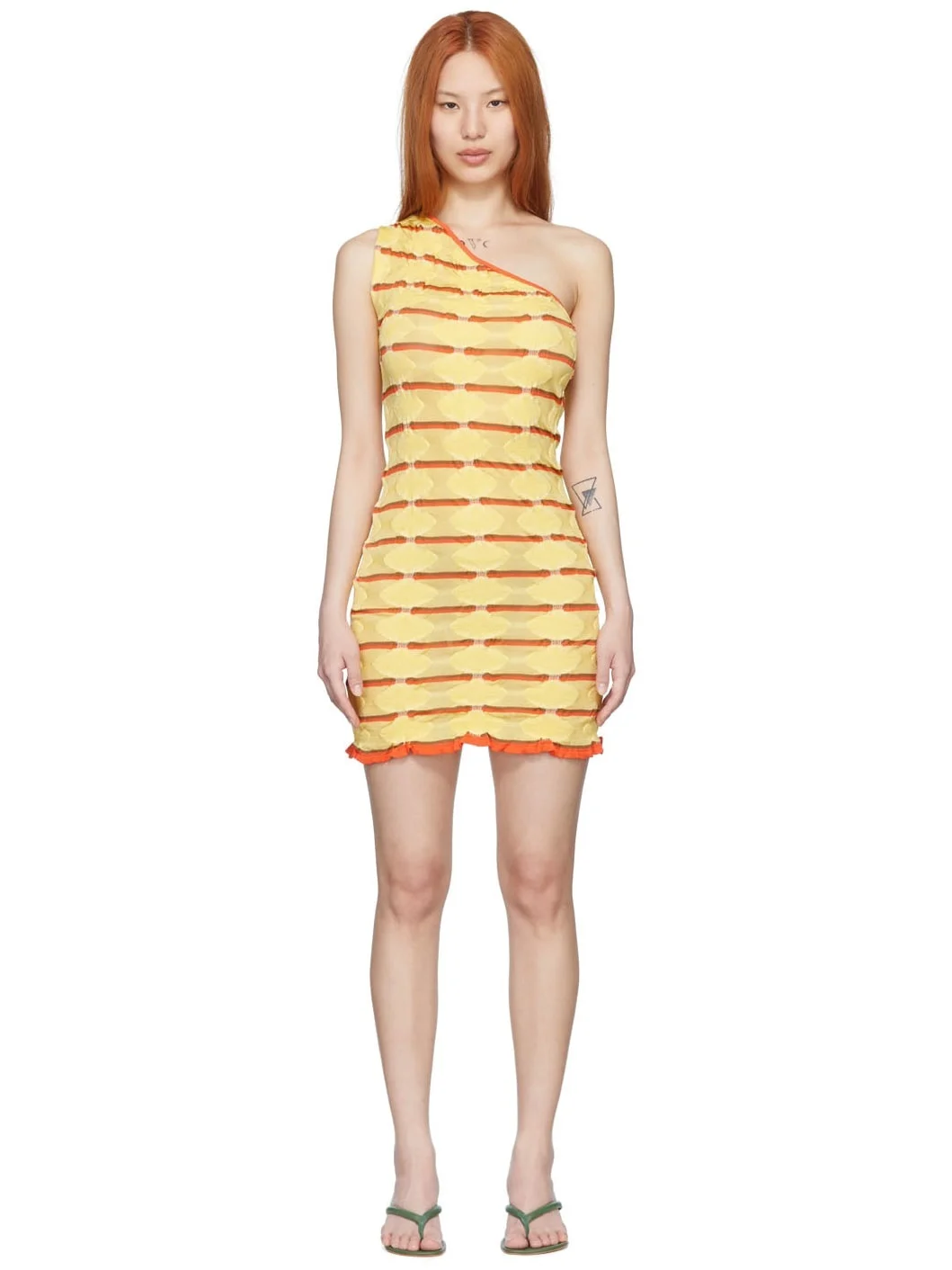 Viscose and lycra-blend jersey dress. Jacquard knit graphic pattern throughout. · Asymmetric construction · Lettuce trim at hem Available exclusively at SSENSE. Supplier color: Yellow 73% viscose, 27% lycra. Made in Spain 221776F052031