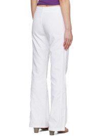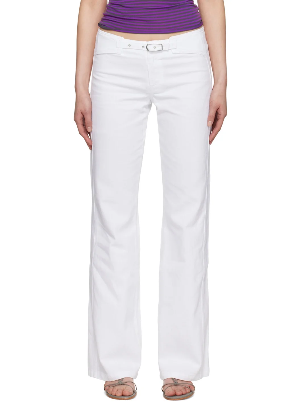 Flared non-stretch denim trousers. · Mid-rise · Integrated pin-buckle strap at waistband · Zip fly · Silver-tone hardware Available exclusively at SSENSE. Supplier color: White 100% cotton. Made in Spain 251776F087011