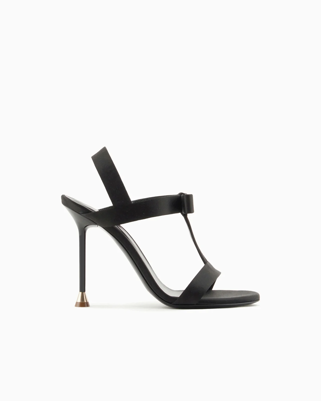Refined T-bar sandals made of black patent leather with a tapered silhouette. The style is distinguished by the applied bow, a feminine detail that maintains an androgynous influence due to its very minimalist, geometric shape. A chic, sophisticated offering, completed by a stiletto heel covered with a gold-coloured metal detail, recalling the footwear from the Prive collection. Product Code: X1PA97XD010100002 Details Composition 72% Viscose 28% Silk Applied bow Covered stiletto heel with metal cone detail Heel height: 10.5 cm Made in Italy