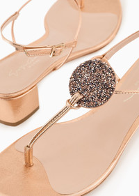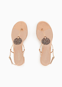 Thong sandals made of exquisite laminated nappa leather, illuminated by a multicoloured rhinestone-covered centrepiece. The style features a strap fastening and covered square heel, elements that ensure a comfortable, secure fit. Perfect for completing sophisticated day and evening looks. Product Code: X1Q066XR1511T933 Details Composition 100% Sheepskin Thong style Strap fastening Rhinestone-covered centre insert detail Covered heel Heel height: 3.5 cm Made in Italy