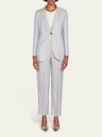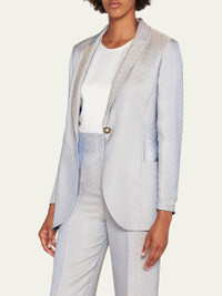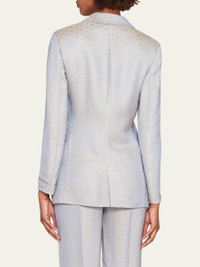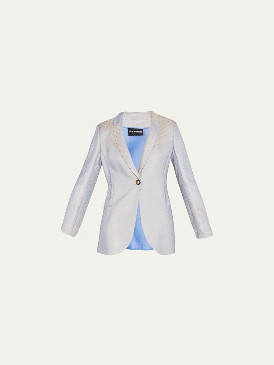 Giorgio Armani blazer jacket in abstract jacquard Peak lapels; single-breasted front Long sleeves Chest welt pocket; side split pockets Tailored fit Center-back vented hem Viscose Lining: Silk Dry clean Made in Italy Model is 5'10"/177cm. Online Inquiries: BGS21_B87EN| Store Inquiries: #4484883