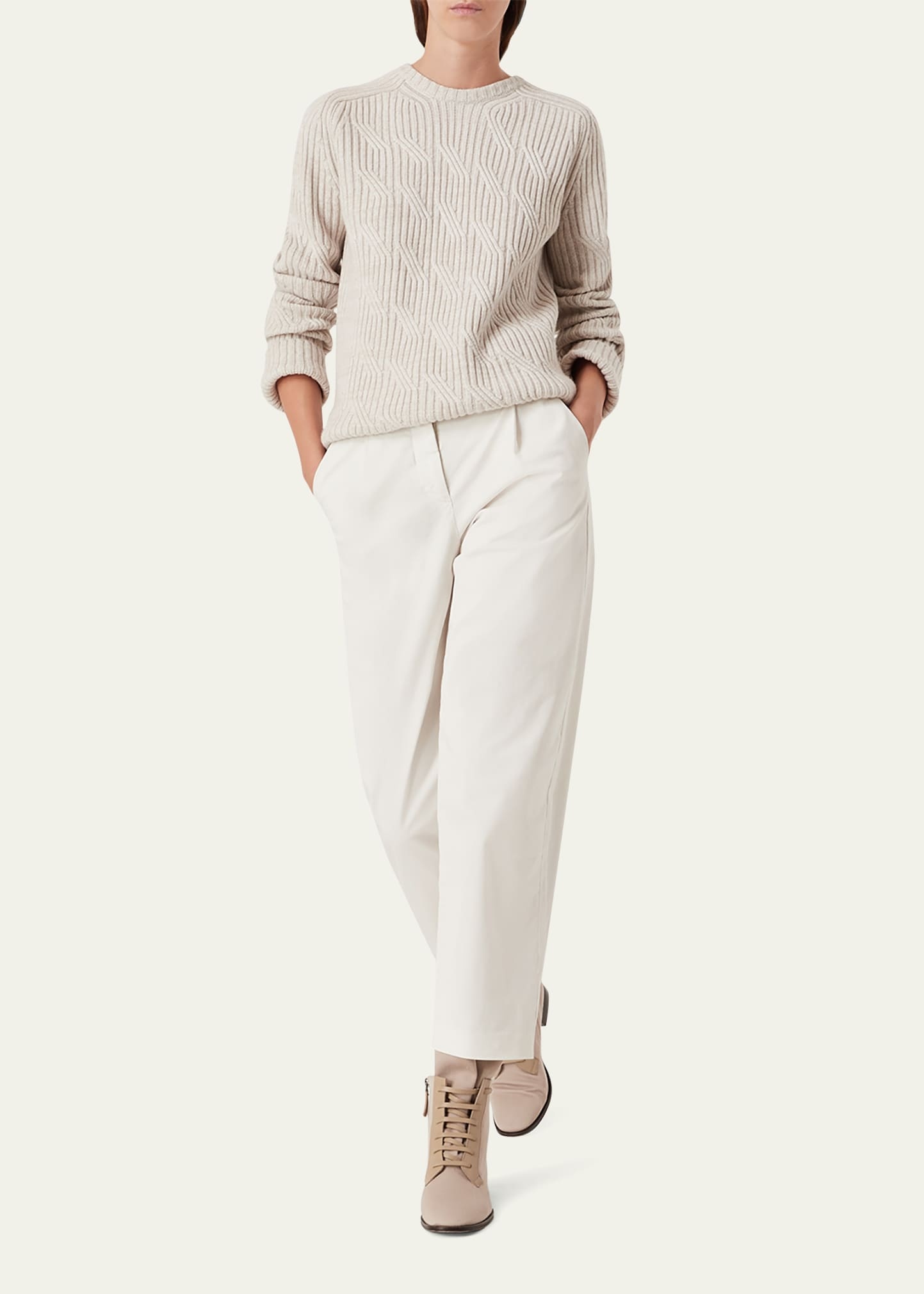 Giorgio Armani "Alasha" textured rib-knit sweater Crew neckline Long sleeves Relaxed fit Pullover style Cashmere Made in Italy Model is 5'10"/177cm. Online Inquiries: BGS21_B6V8R| Store Inquiries: #4207985