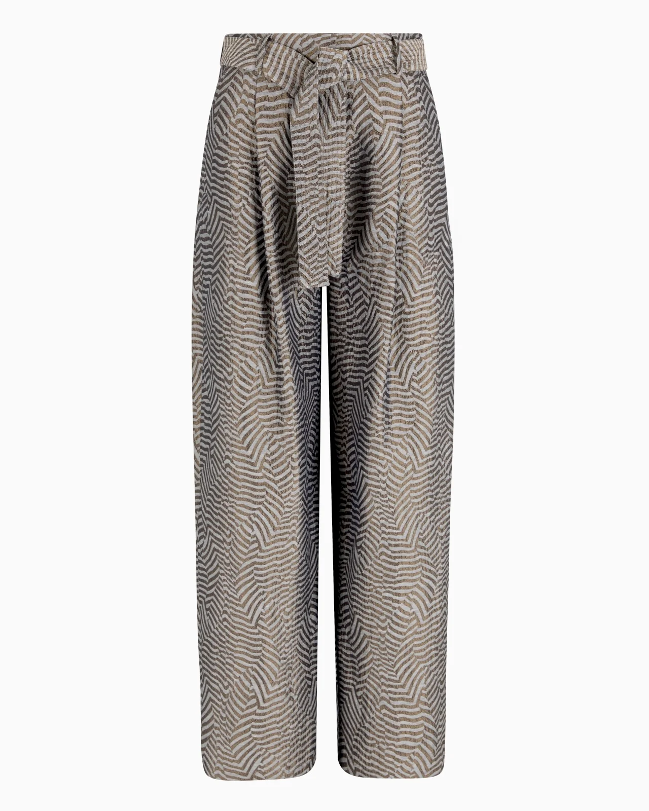 A sophisticated jacquard with an abstract geometric motif inspired by an archival design adorns the relaxed lines of these one-pleat trousers. Made of viscose, silk, linen and cotton, the style features a matching waistband and flap pockets, details that accentuate its laid-back spirit. An item for effortlessly chic looks, perfect for numerous occasions. Waistband with belt loops Belt in the same fabric Concealed hook-and-button closure Two side pockets Two back flap pockets Unlined Made in Italy Product Code: GW000856TE13692F8009
