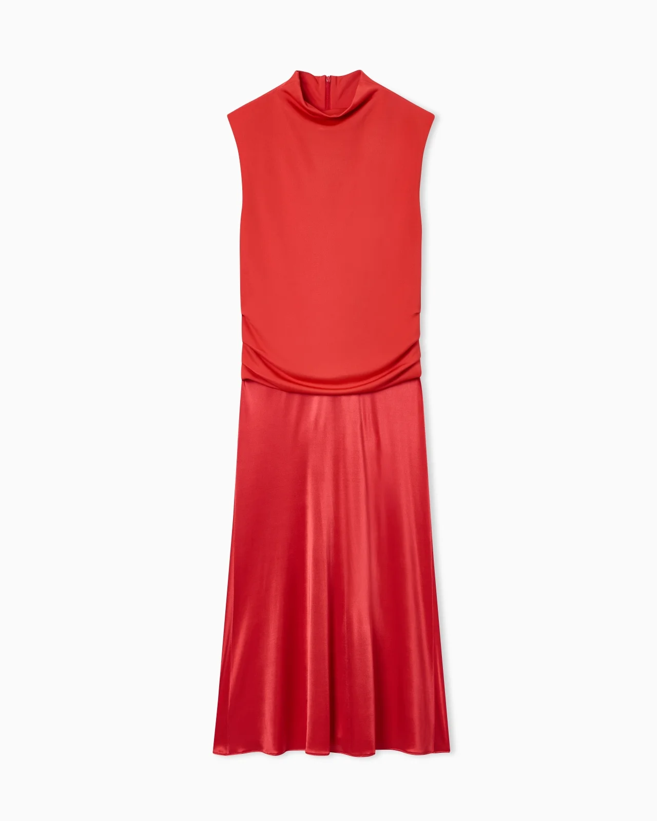 Minimalist dress made of cosy double viscose jersey. An elegant, bright offering that is perfect for a special occasion. The piece is part of the Holiday selection, which ranges from warmer to cooler tones with shades of coral red and grey, colours that create a refined, evergreen palette. The collection offers fluid shapes and smooth fabrics for a touch of modernity that never compromises on classic elegance. Upper fabric: 84% viscose from responsibly-managed forests; Lower fabric: 100% viscose from responsibly-managed forests; Lining: 100% viscose from responsibly-managed forests Upright collar Sleeveless design Waist belt detail Closure with small buttons at the neck and an invisible zip Length: 67 cm Made in Italy Product Code: GW003301AF24670U5005