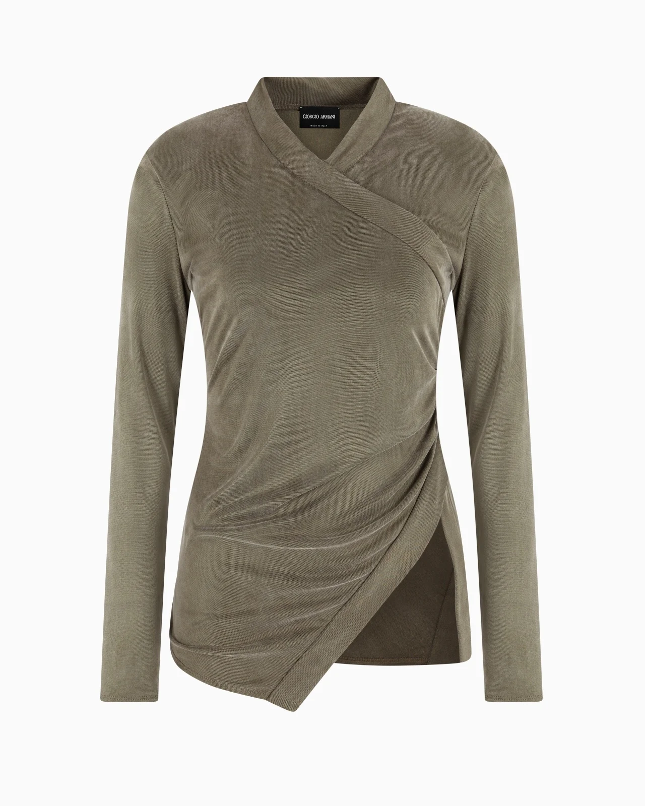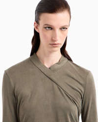 Long-sleeved jumper made of cupro jersey, defined by the asymmetric effect created by the diagonal front panel. A silky, comfortable style to wear that follows the female silhouette without restrictions. A perfect piece to pair with the collection’s trousers. V neck Long sleeves Diagonal front panel Made in Italy Product Code: GW000912AF15057U7042