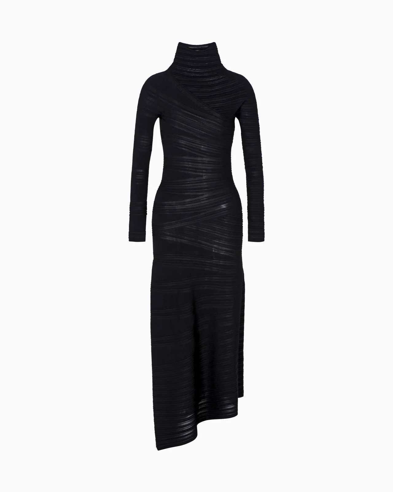 Sculptural midi dress made of a viscose and virgin wool knit. The style features a sophisticated texture of horizontal and diagonal stripes, produced by the all-over KFB construction creating a three-dimensional effect. Finished with a stand collar, long sleeves and asymmetric hem for added movement. A feminine offering with understated sensuality, perfect for a look with a modern feel. Fineness: 18 KFB construction Upright collar Long sleeves Asymmetric hem Length: 95 cm from the waist on the long side Made in Italy Product Code: GW002136AF19807UC001